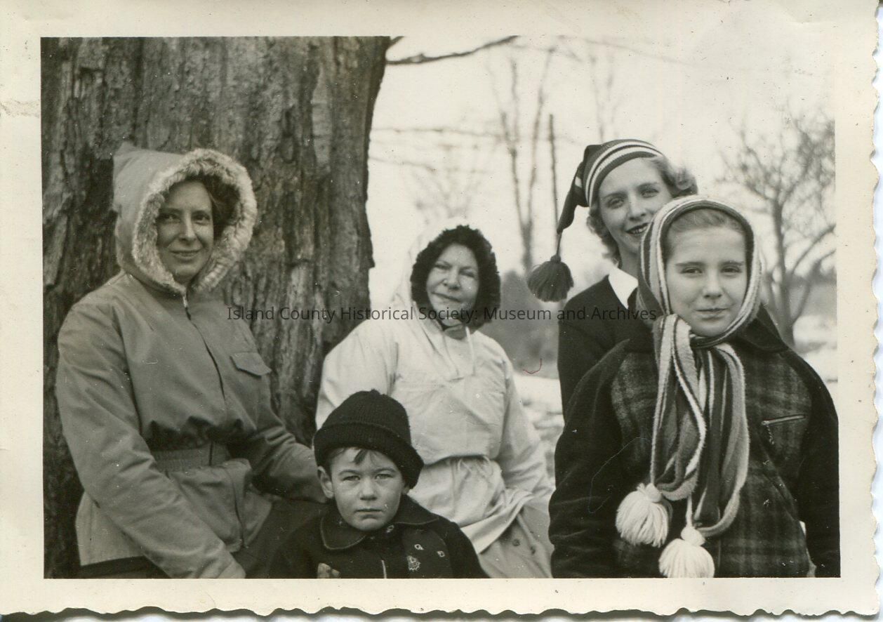 A black and white photo of a group of five people outside in the winter. There are three adult women and two children. They are all wearing winter jackets and hats. There are a few bare trees in the background and some snow on the ground.