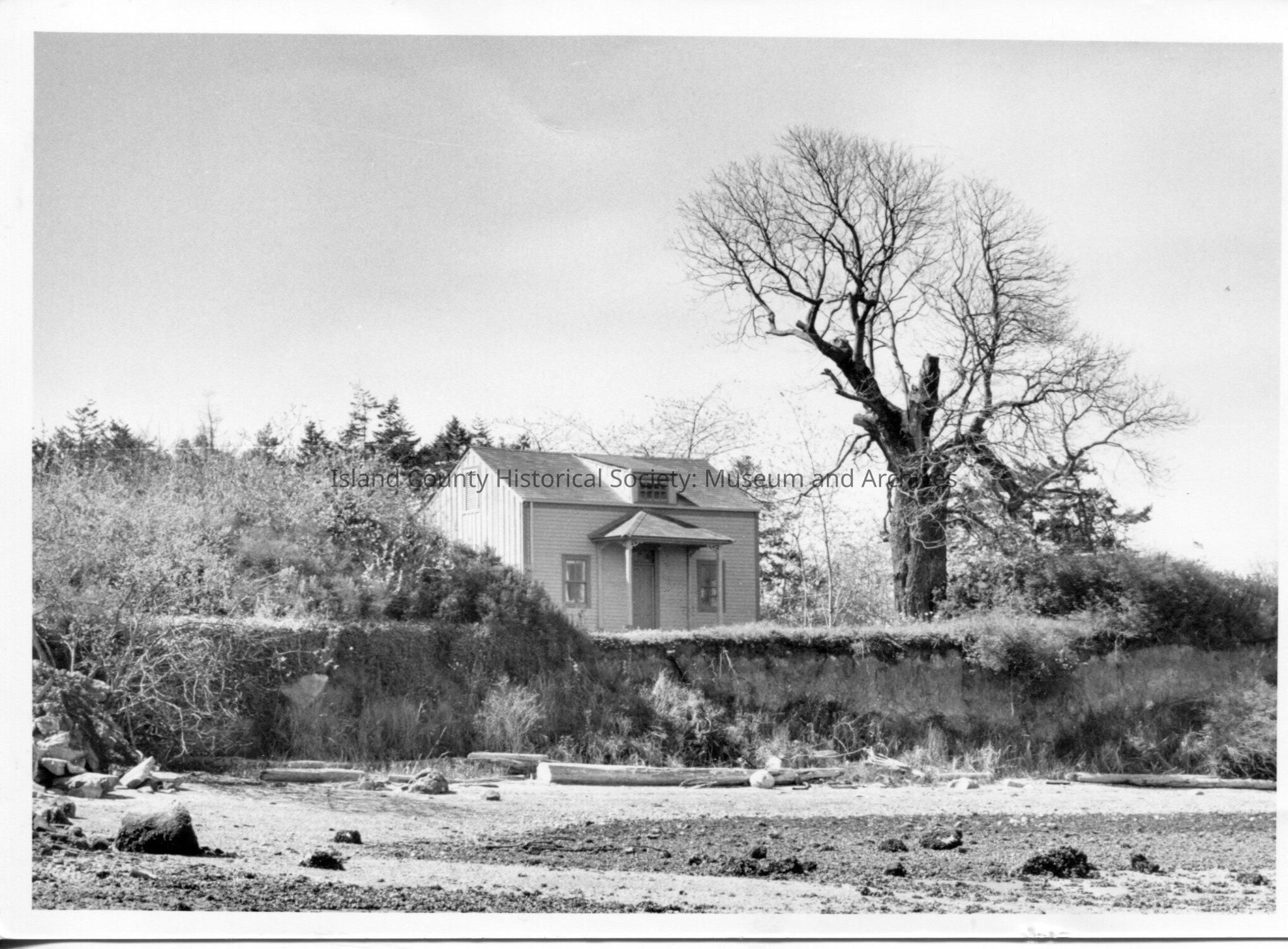 Photo of a house next to a tree. Handwritten on the back is "taken in 1988 by Harry Moore; Coupeville Captain Coupe house as it is today."