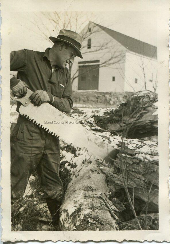 A black and white photo of a man sawing a tree. The tree is on the ground and the man is using a hand-saw. He is wearing gloves, a hat and glasses. There is some snow on the ground and on the tree. There is a house in the background.