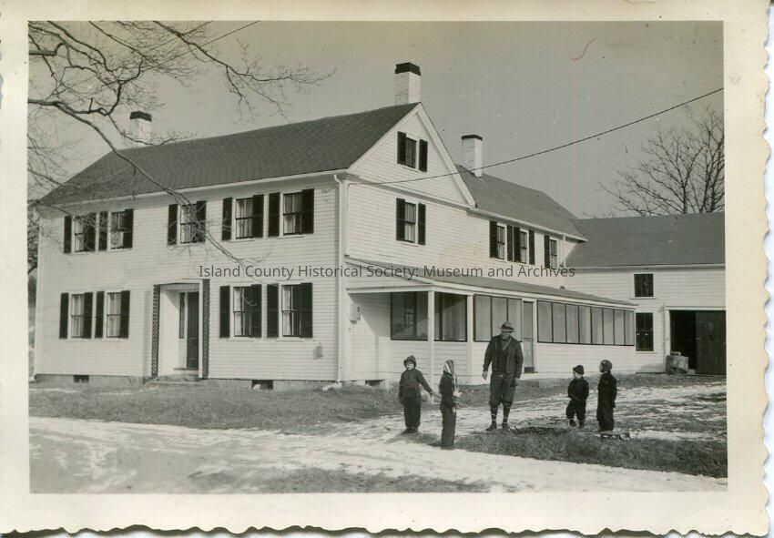 A black and white photo of a group of five people standing outside a house. There is a man with four kids and two or three of the kids have sleds with them. There is some snow on the ground. Everyone is wearing winter clothing. There is a large white house in the background.