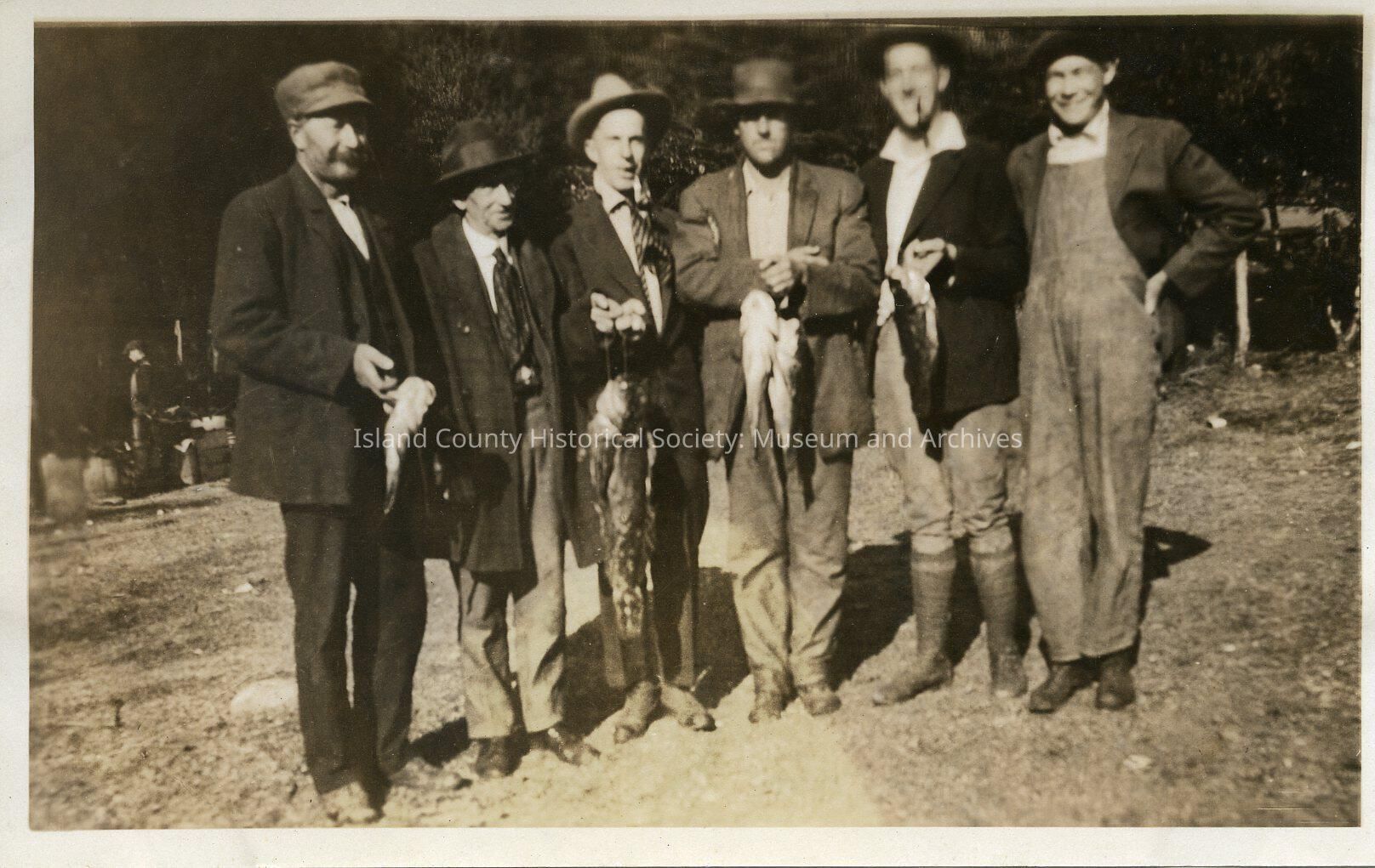 A photo of six men standing outside and several holding fish. Handwritten on the back is "2nd from L. Harvey Hill, 3rd, Harold, 5th Ted Hill. "