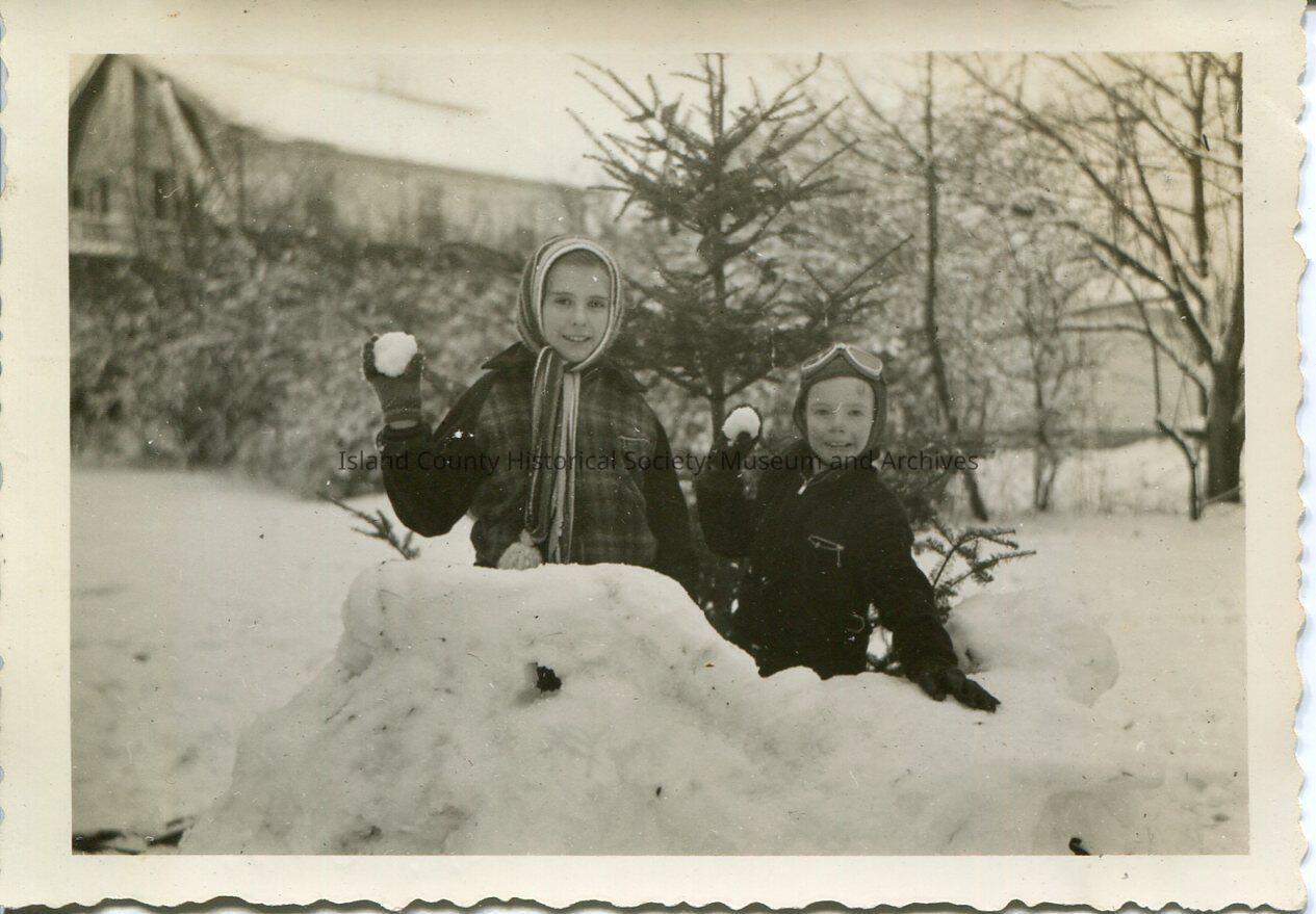 A black and white of two kids behind a snow fort smiling and holding snowballs in their right hands.