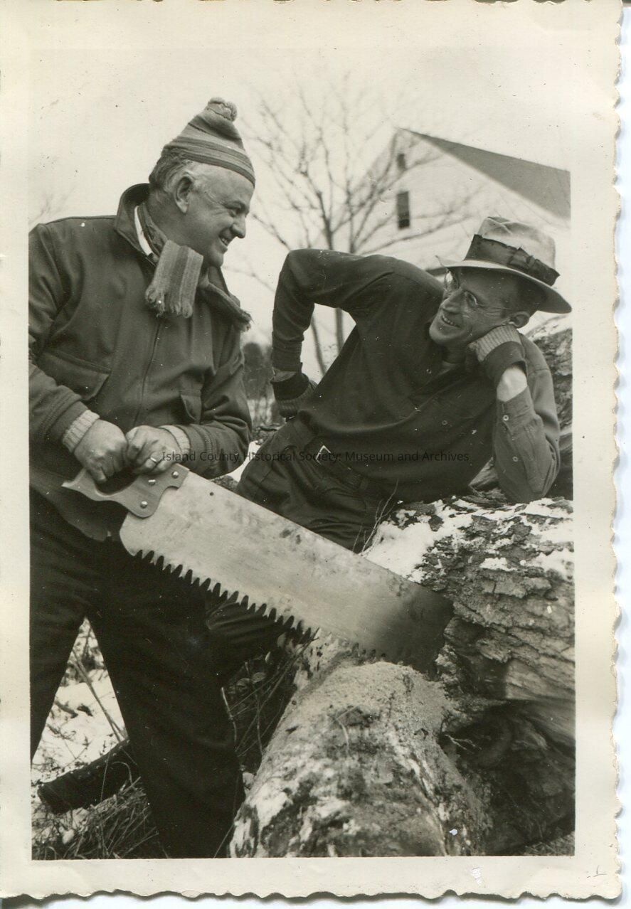 Two men smiling at each other, one is leaning forward while the other is leaning back onto a log. The older gentleman is holding a saw.