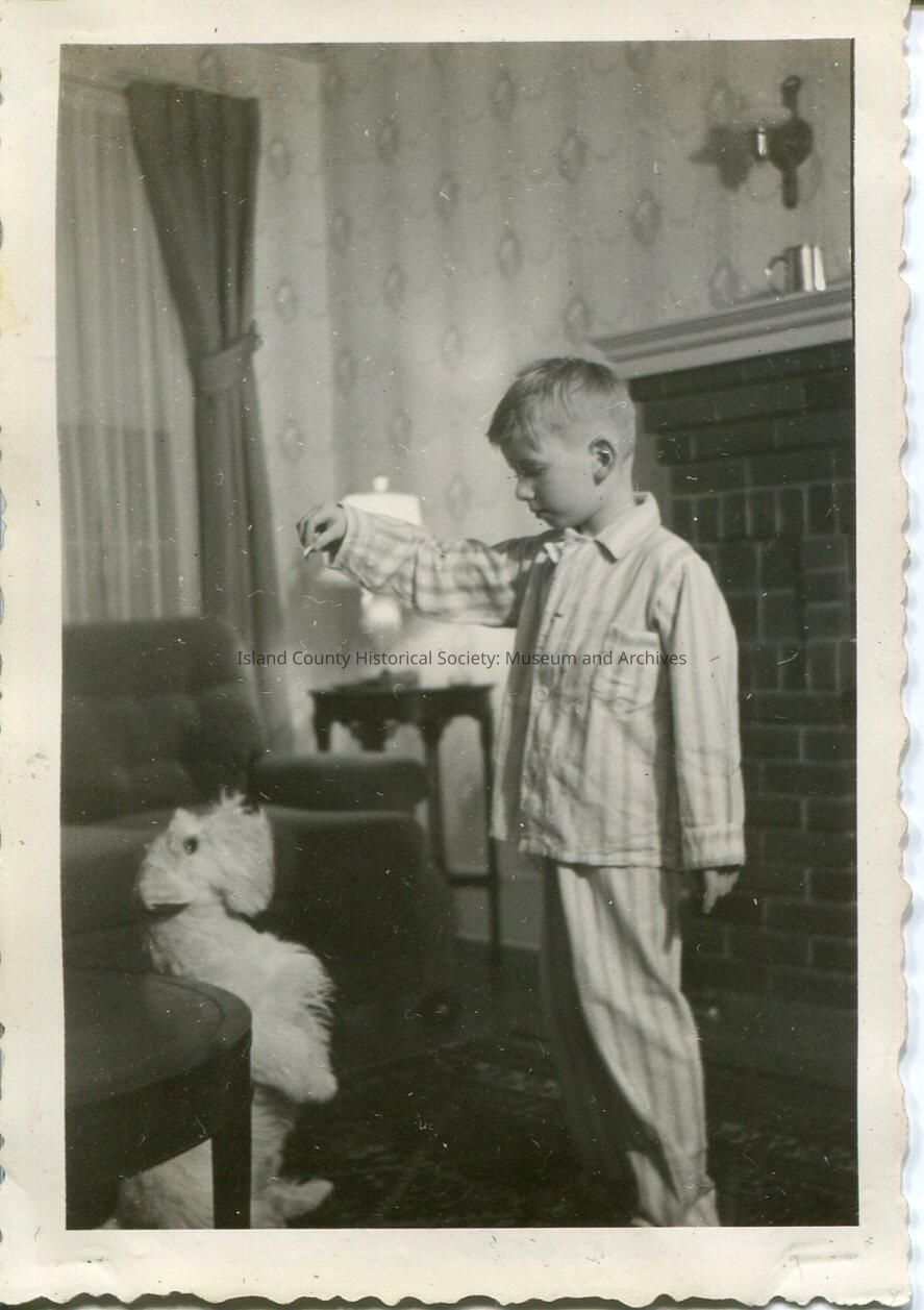 A black and white photo of a little boy holding a treat, while a little dog is on its back legs standing up looking at the treat.