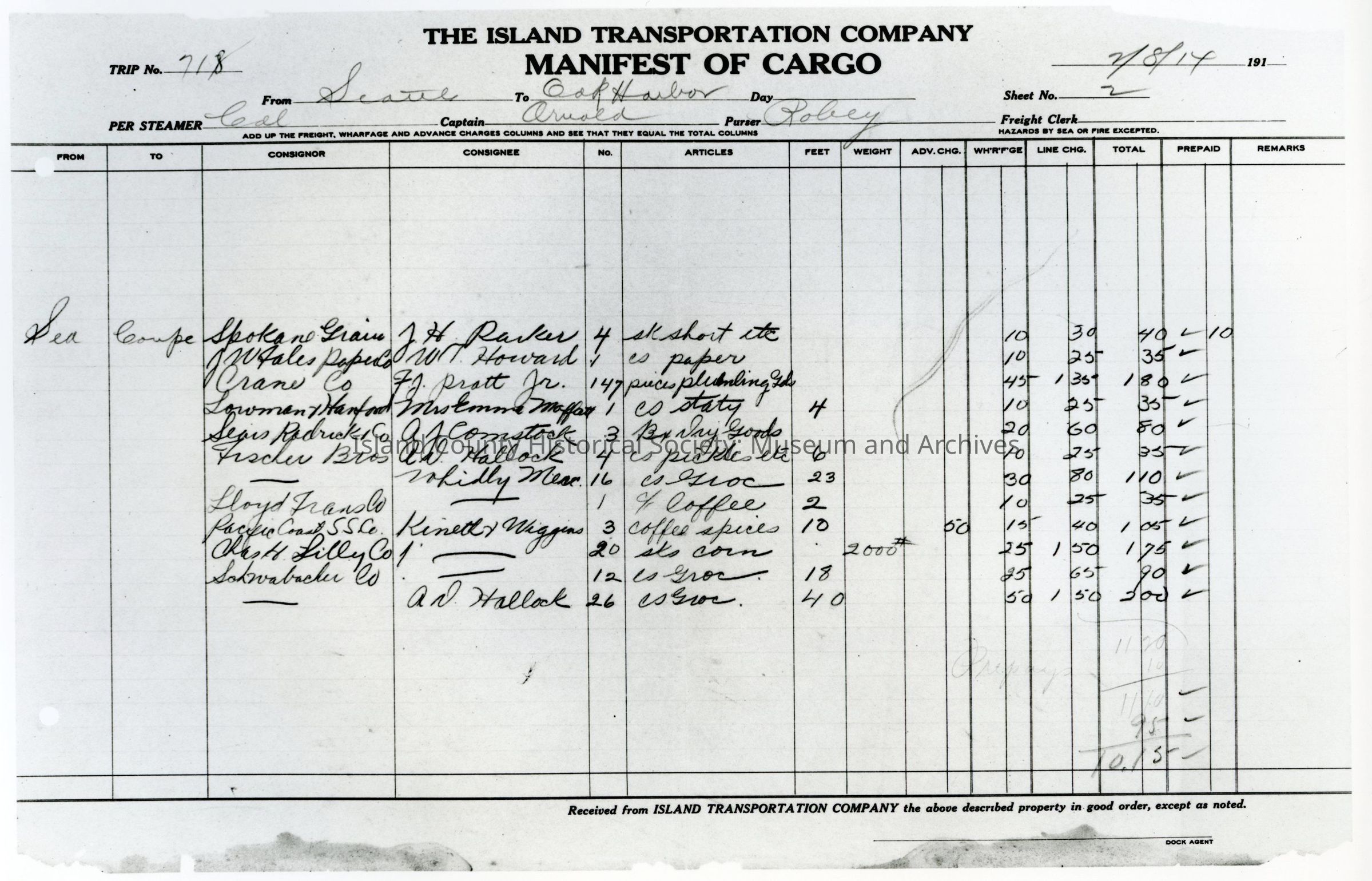 On back: "Copy of Cargo of Manifest found in the walls of the Coupeville Wharf - steamer Calista. Captain Henry Arnold"
