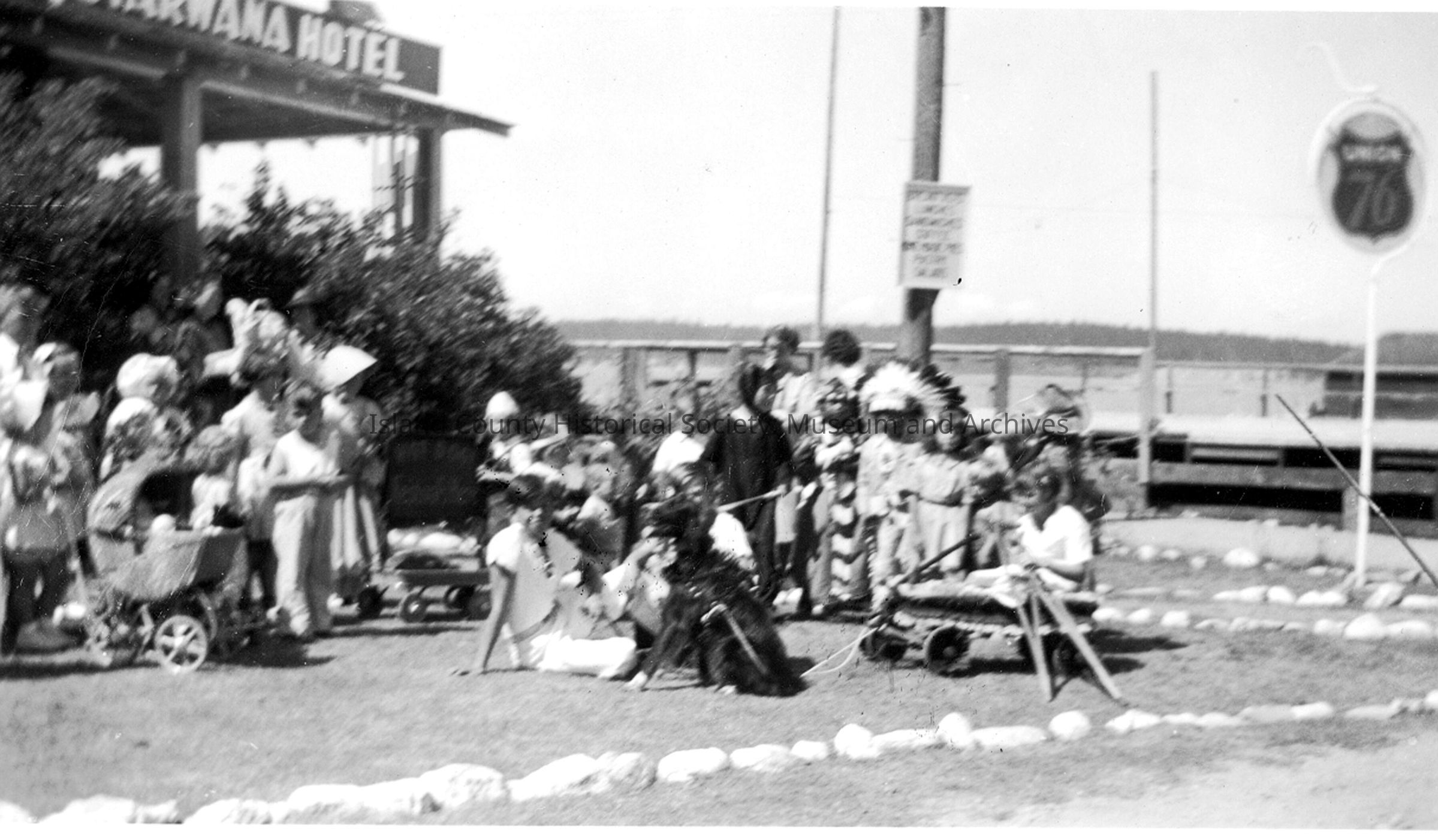 Black and white negative showing group of people in front of the Starwanna Hotel with black dog. Blurred image. Mostly children who sit or stand along the road side. A Native American man and one or two Native American children are in full ceremonial dress. A signpost along the street: Union 76.