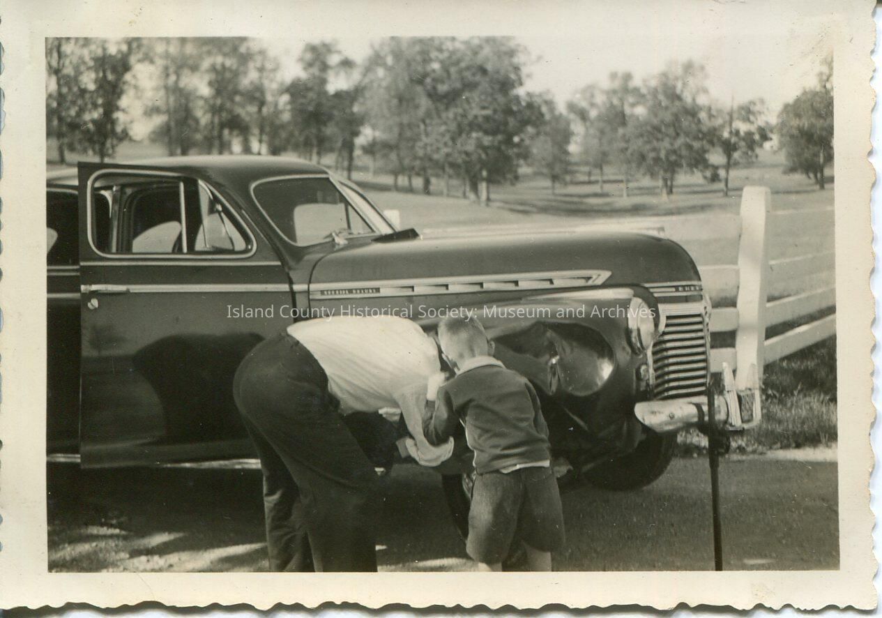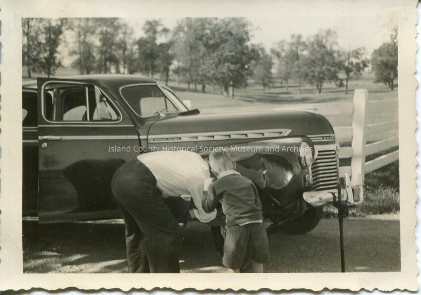 A black and white photo of a man changing a car tire with a young boy beside him. There is a white fence behind the car.