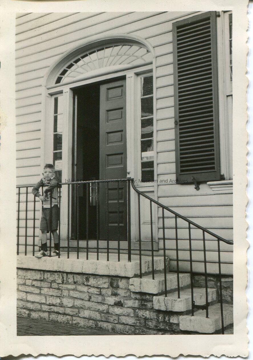A black and white photo of a young boy standing on a roofless porch, metal railing, double door entry, fan vaulting/fan window over the door. Windows have shutters. Brick and stone stairs and porch. Siding.