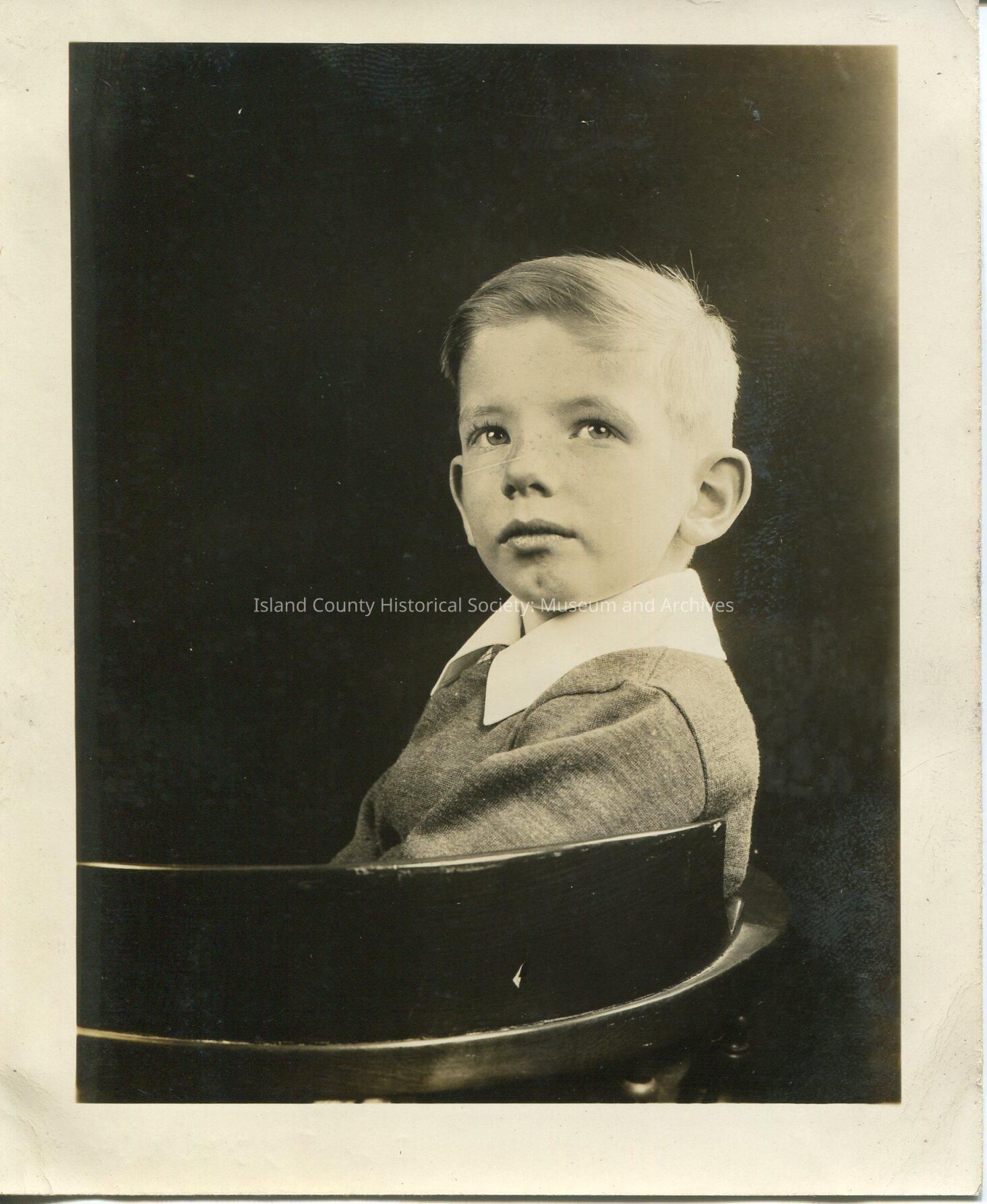 A black and white photo of a boy sitting sideways in a chair with his back to the right of the photo and facing the camera. He is wearing a large-collared shirt and probably wool sweater. He is looking slightly upward and to the right. Series of photos: 2015.074-175-.177.
