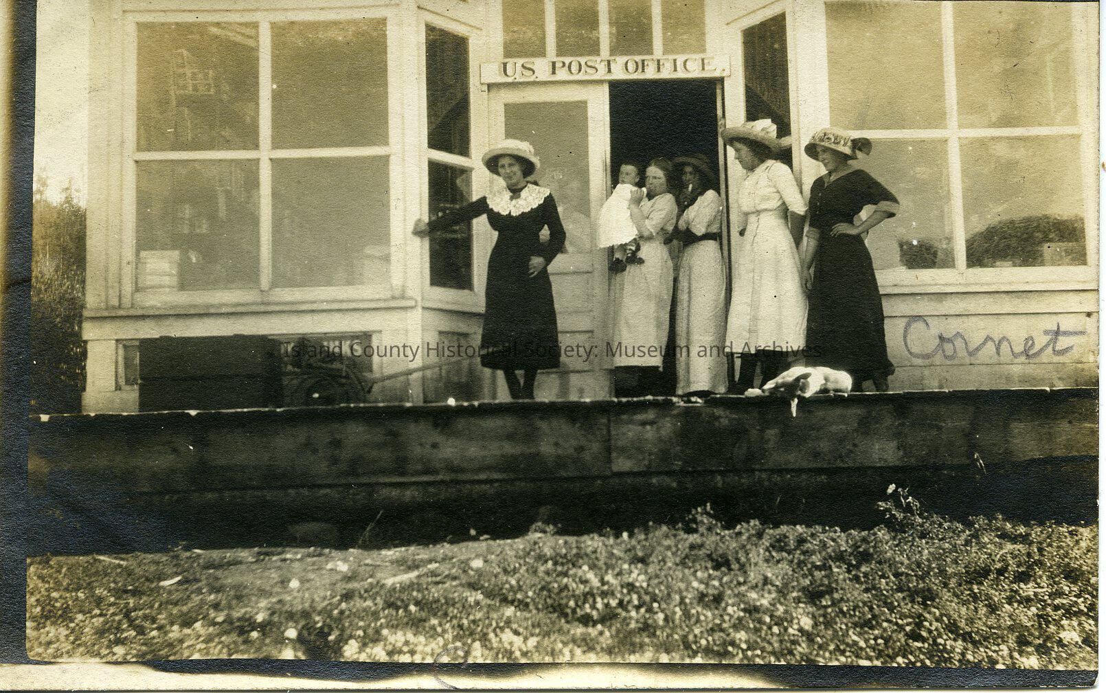 A photo of several women standing outside the US Post Offfice. One woman is holding a baby.Made/Created