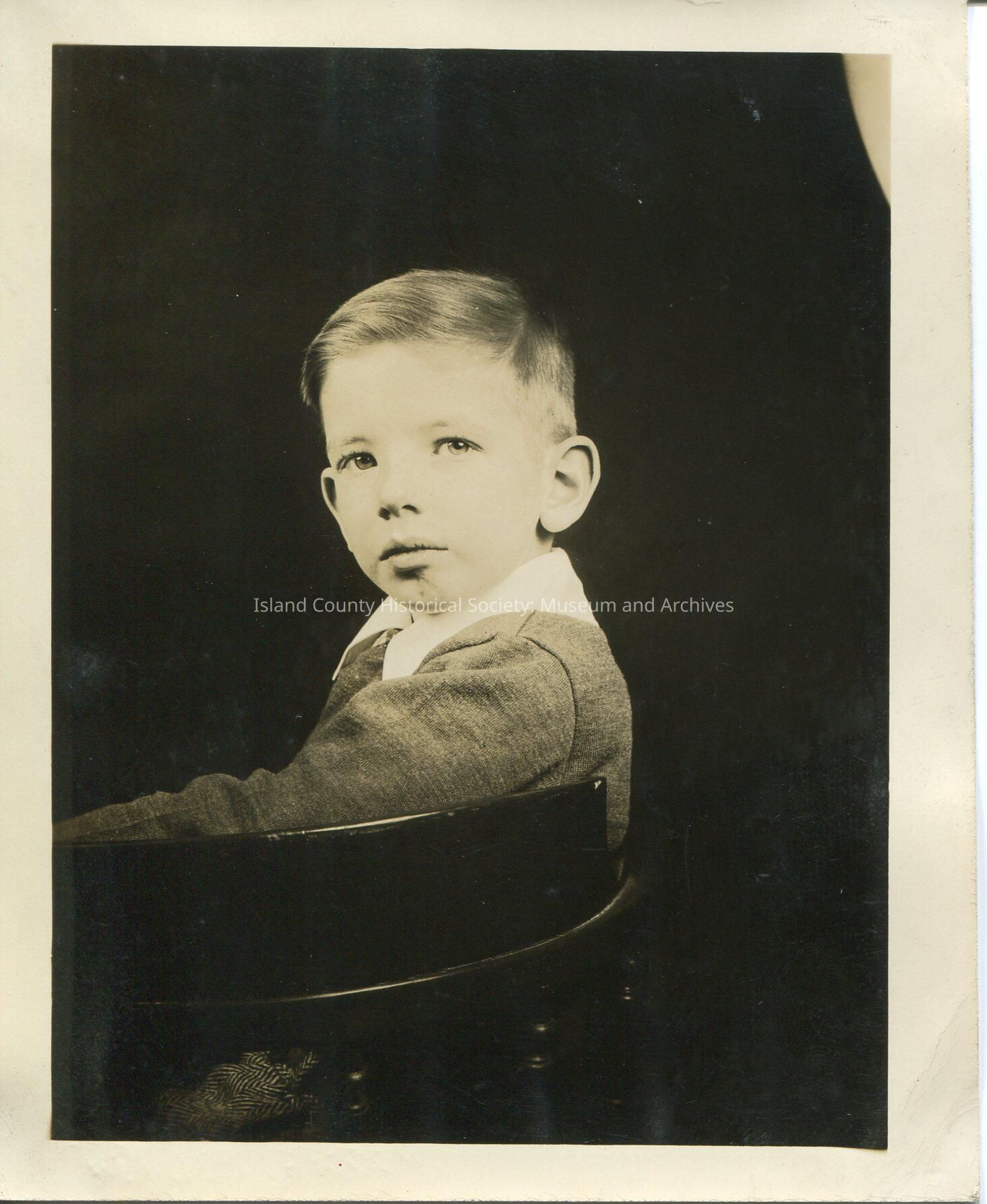 A black and white photo of a boy sitting sideways in a chair with his back to the right of the photo and facing the camera. He is wearing a large-collared shirt and probably wool sweater. He is looking slightly upward and to the right and his head is tipped slightly to the left and down. His arm is resting on the back of the chair. Series of photos: 2015.074.175-.177.