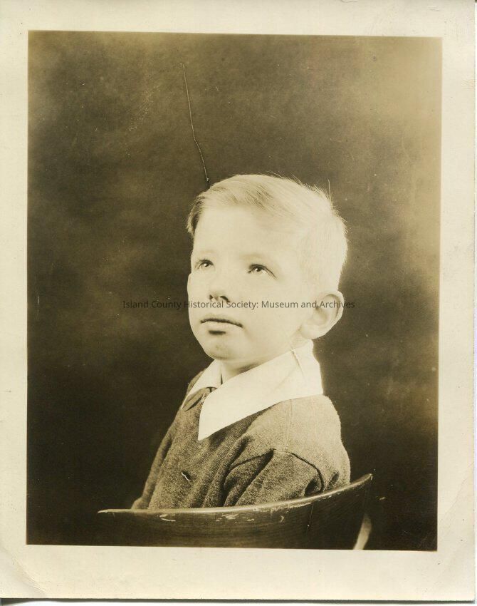 A black and white photo of a boy sitting sideways in a chair with his back to the right of the photo and facing the camera. He is wearing a large-collared shirt and probably wool sweater. He is looking slightly upward and to the left and his head is tipped slightly upward. the photo has faded on the top right corner. Series of photos: 2015.074.175-.177.