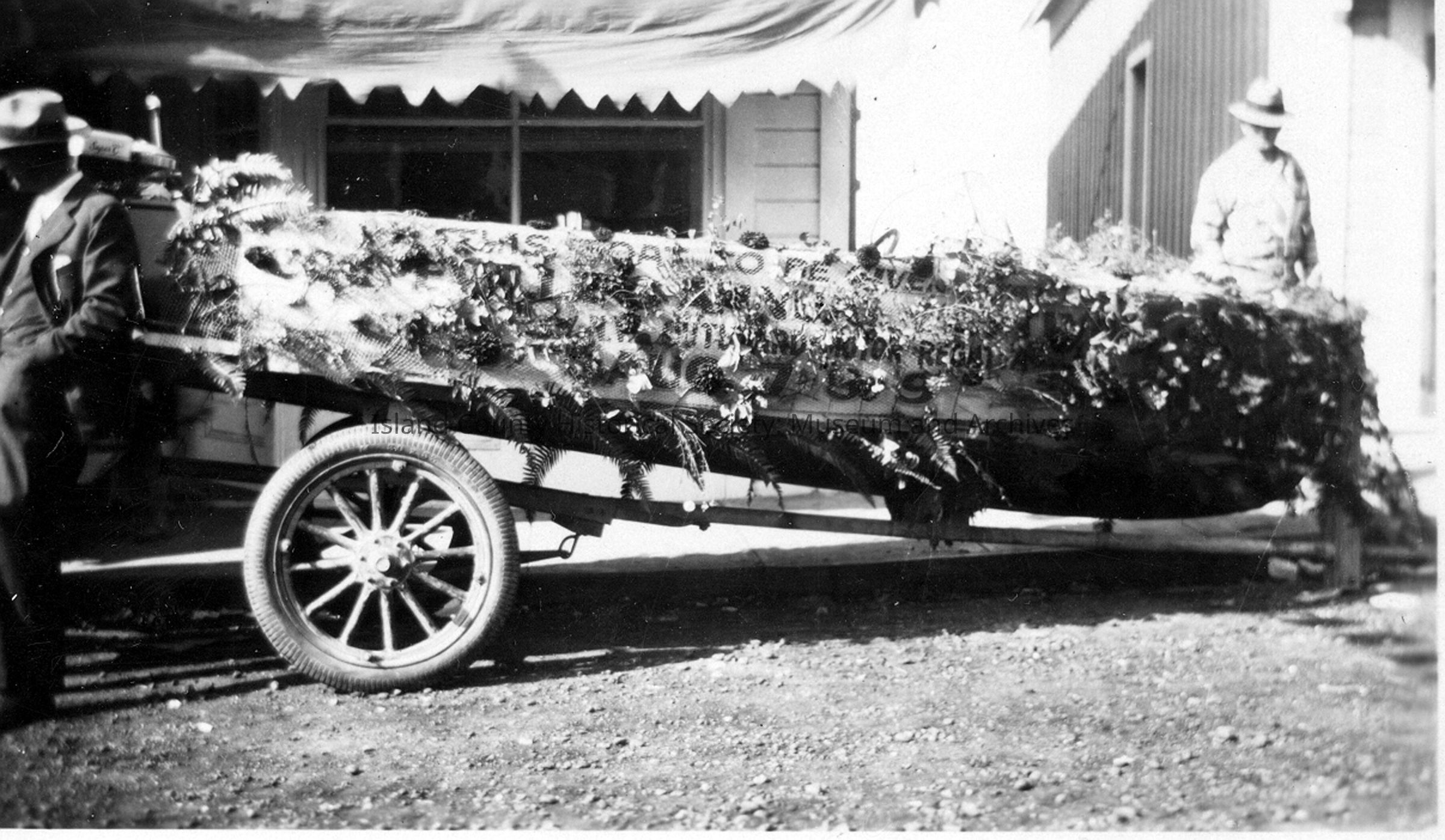 A black and white photograph of a boat covered in ferns and leaves on a trailer. The boat has writing along the side of it, obscured by the ferns. Two men stand near it, one on either side. They appear to be dressed in 1930s-40s garb. Two buildings and pathway behind the boat.Collection