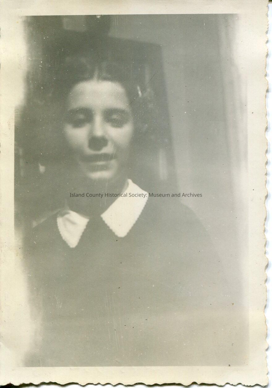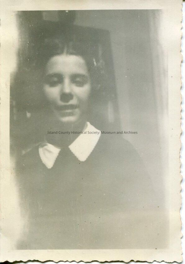 A black and white photo of a girl facing the camera but looking slightly down She has on a light-colored, large-collared, shirt or blouse under something dark. Her hair is parted in the center. Series of photos: 2015.074.178-181.