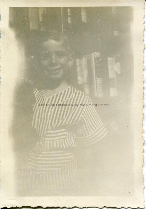 A black and white photo of a boy in front of a bookcase He is wearing striped pajamas and holding a soft-toy -possibly a bear. He is grinning. Series of photos: 2015.074.178-.181.