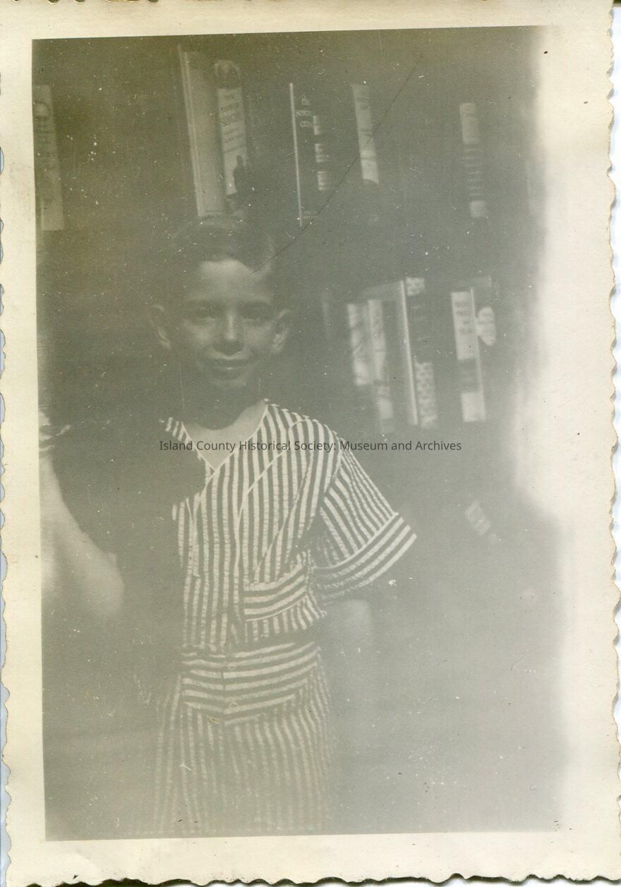 A black and white photo of a boy in front of a bookcase He is wearing striped pajamas and holding a soft-toy -possibly a bear. His right arm is crooked upward. Smiling. Series of photos: 2015.074.178-.181.