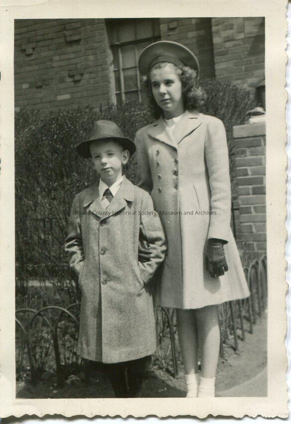 A black and white photo of a boy and a girl. He is wearing an overcoat and hat, she has a knee-length coat, hat and gloves. They are facing the same way, her left arm is down. They are in front of a brick house, iron raling beside the sidewalk. Series of photos: 2015.074.182-.186.Made/Created