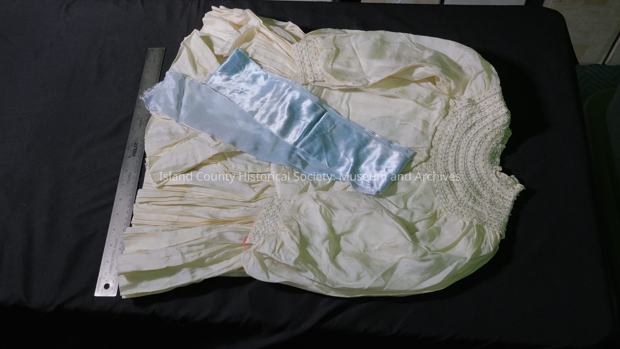 Child's silk dress with blue French knots and fagoting, accordian pleating.