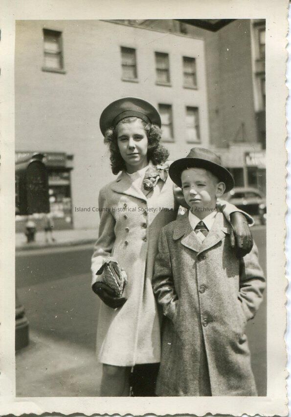 A black and white photo of a boy and a girl. He is wearing an overcoat and hat, she has a knee-length coat, hat and gloves, and probably a rose on her left lapel. They are facing the camera, her left arm is draped over his shoulder. She is holding a handbag in her left hand. They are in front of a large multi-story building. Series of photos: 2015.074.182-.186.Made/Created