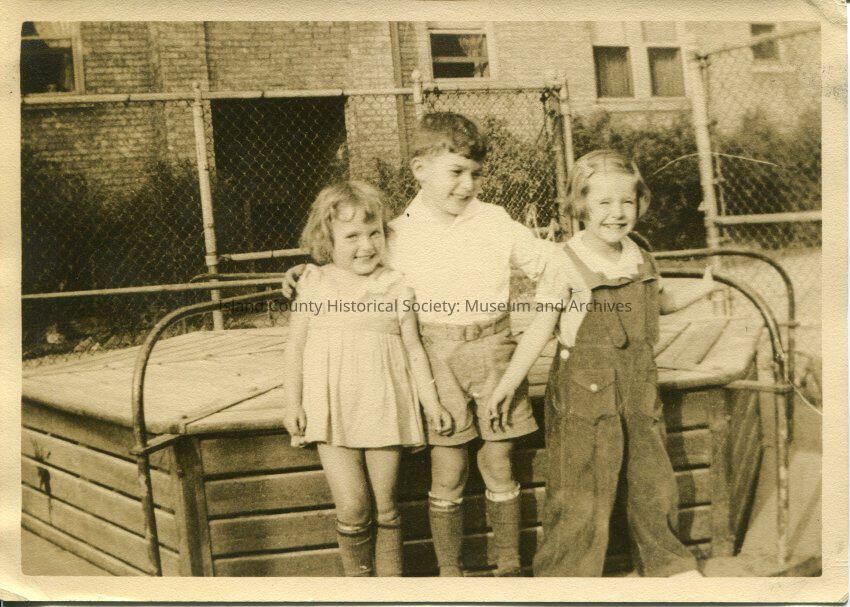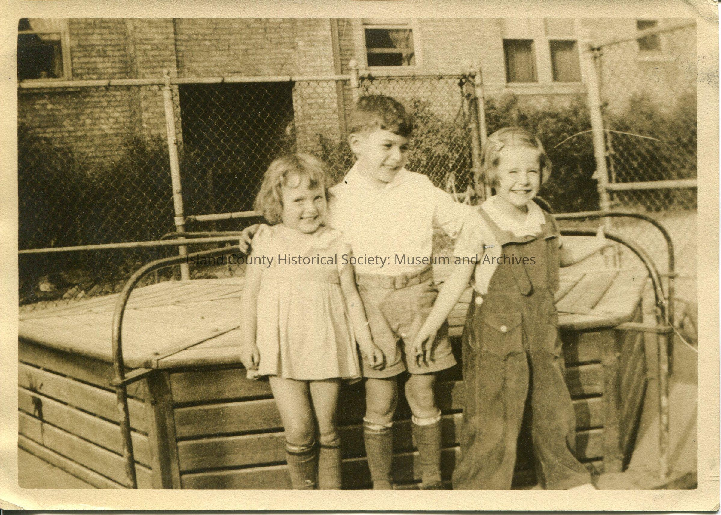 A black and white photo of a boy and two girls standing on a round-about or merry-go-round in a fenced area - possibly a playground - there is a brick building in the background. He is wearing a shirt and shorts. The girl on his left is wearing overalls and a shirt, and the other girl a short dress.