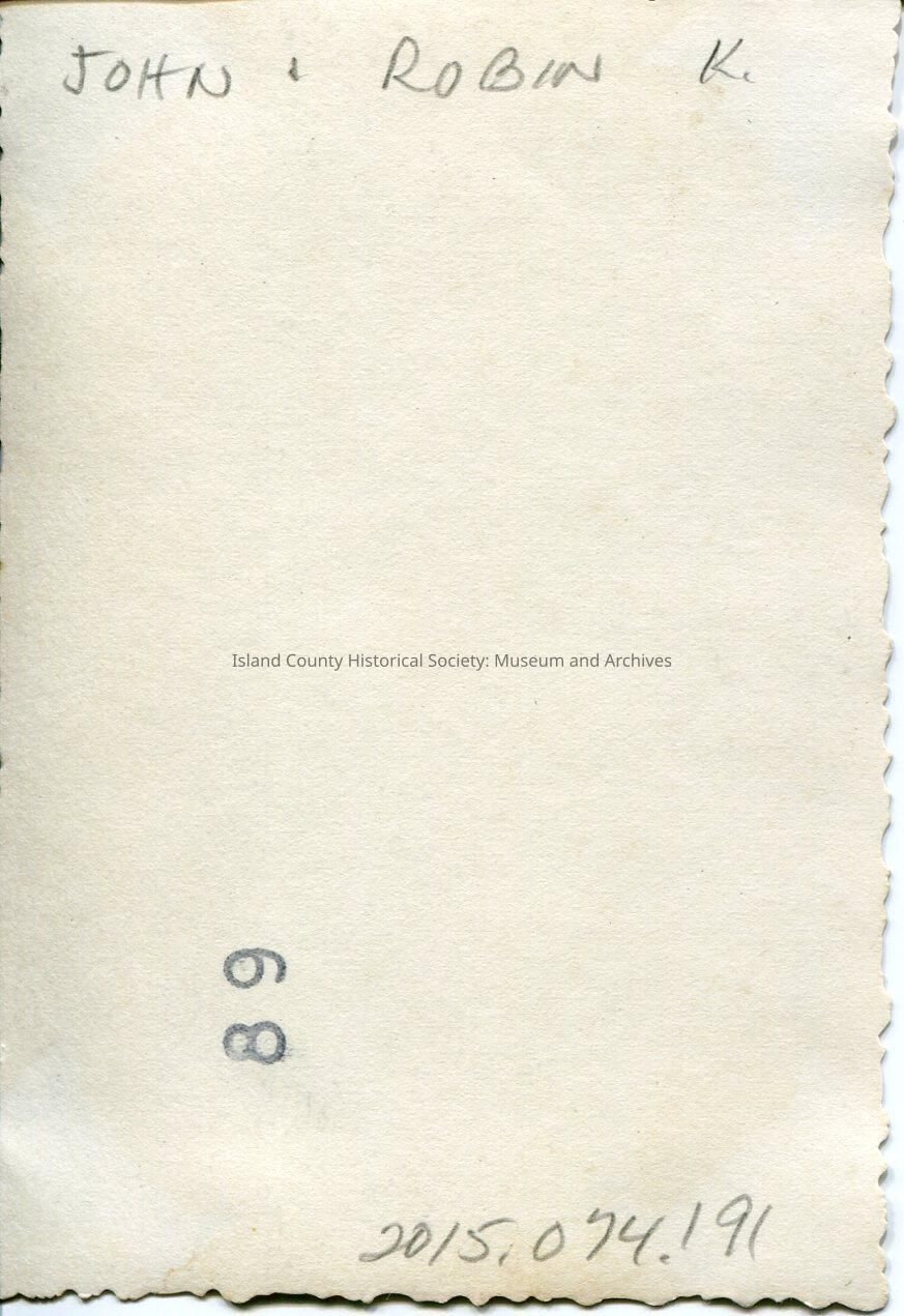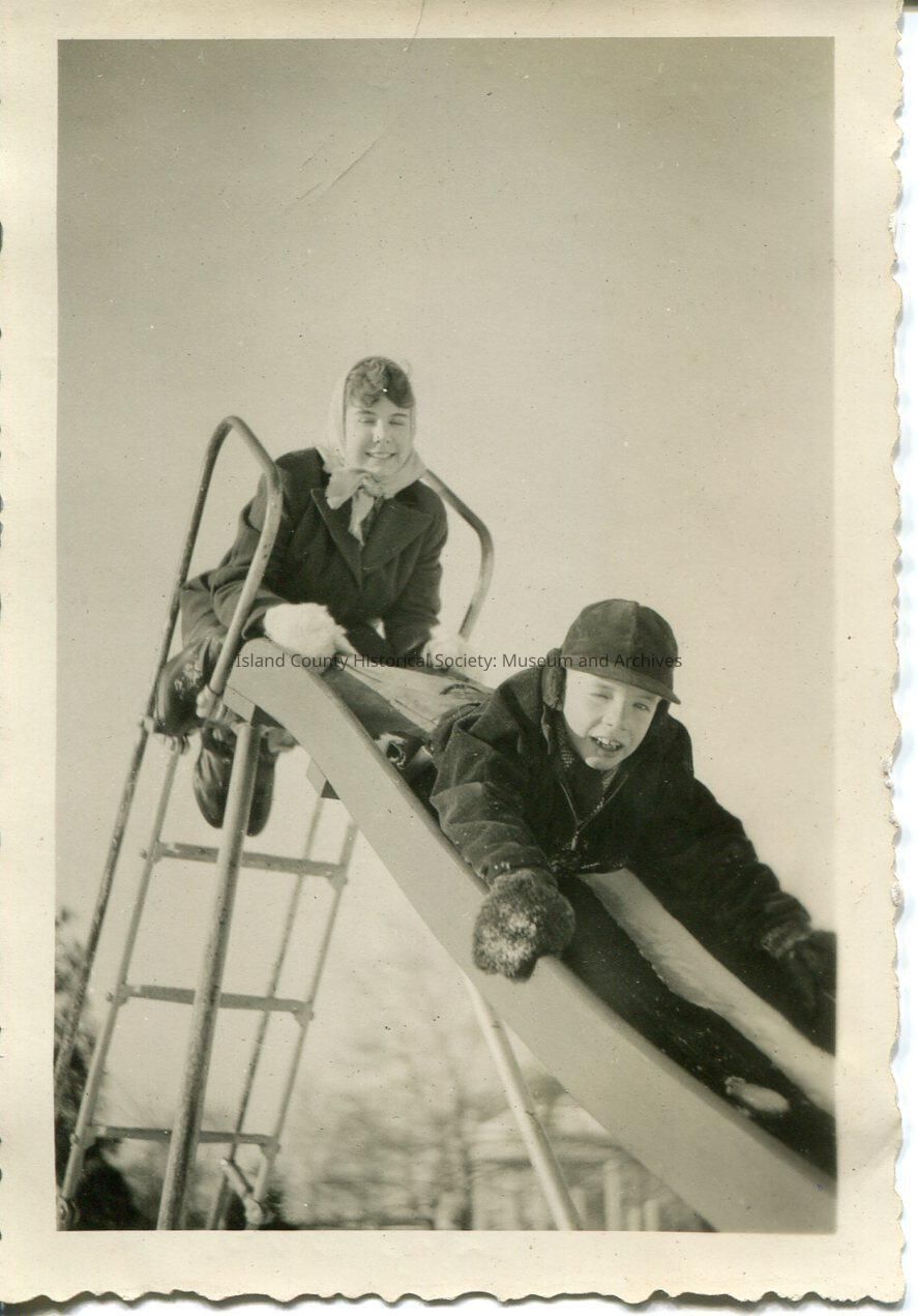 A black and white photo of a boy and a girl on a slide - she is on the top step holding the legs of the boy who is face down. She has a on coat and gloves and is wearing a scarf on her head. He is wearing a jacket, gloves and hat. John & Robin K. is written on the back. Series of photos: 2015.074.189-.195.