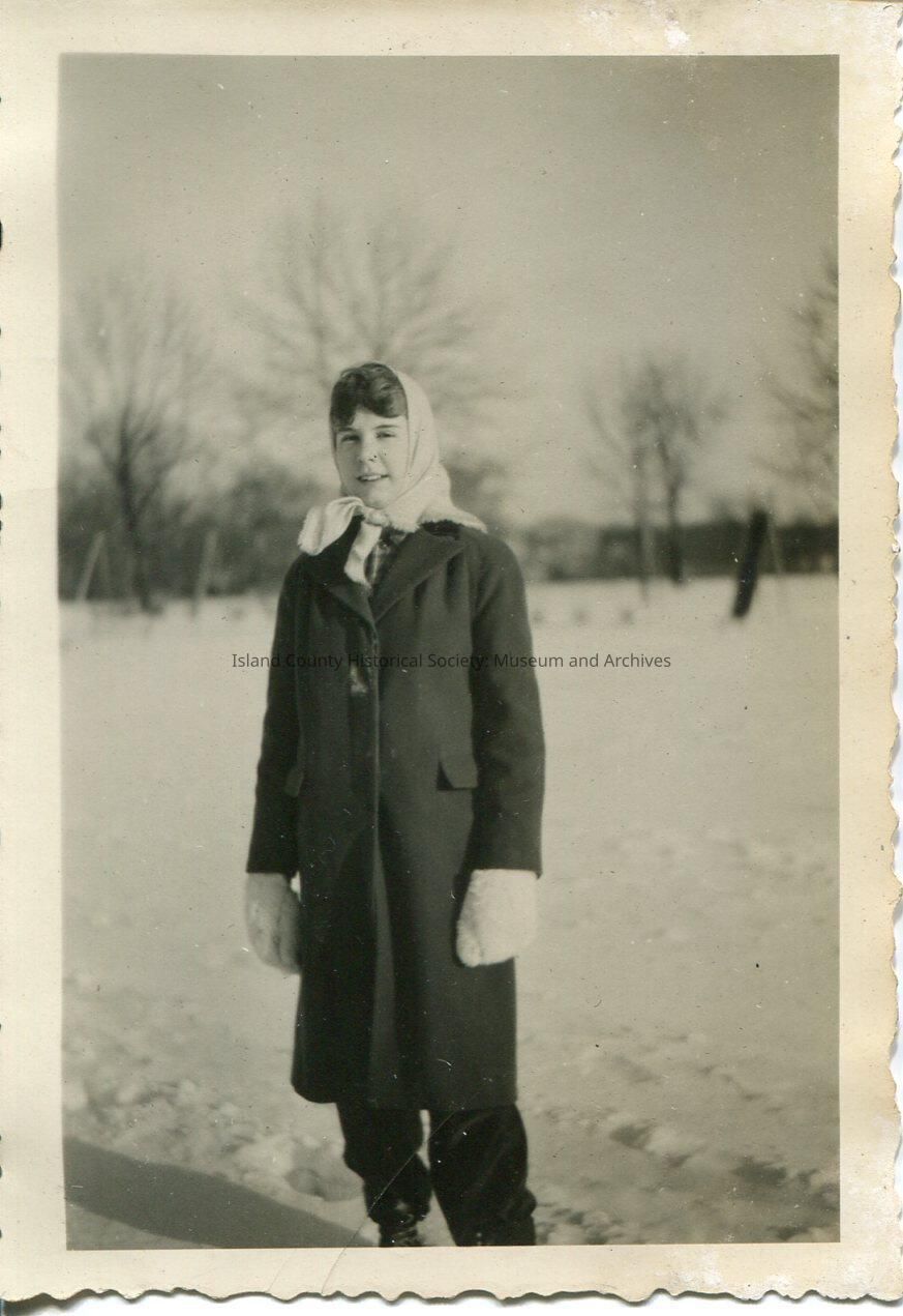 A black and white photo of a girl standing in the snow. She has on a coat and gloves and is wearing a scarf on her head. Robin K. is written on the back. Series of photos: 2015.074.189-.195.