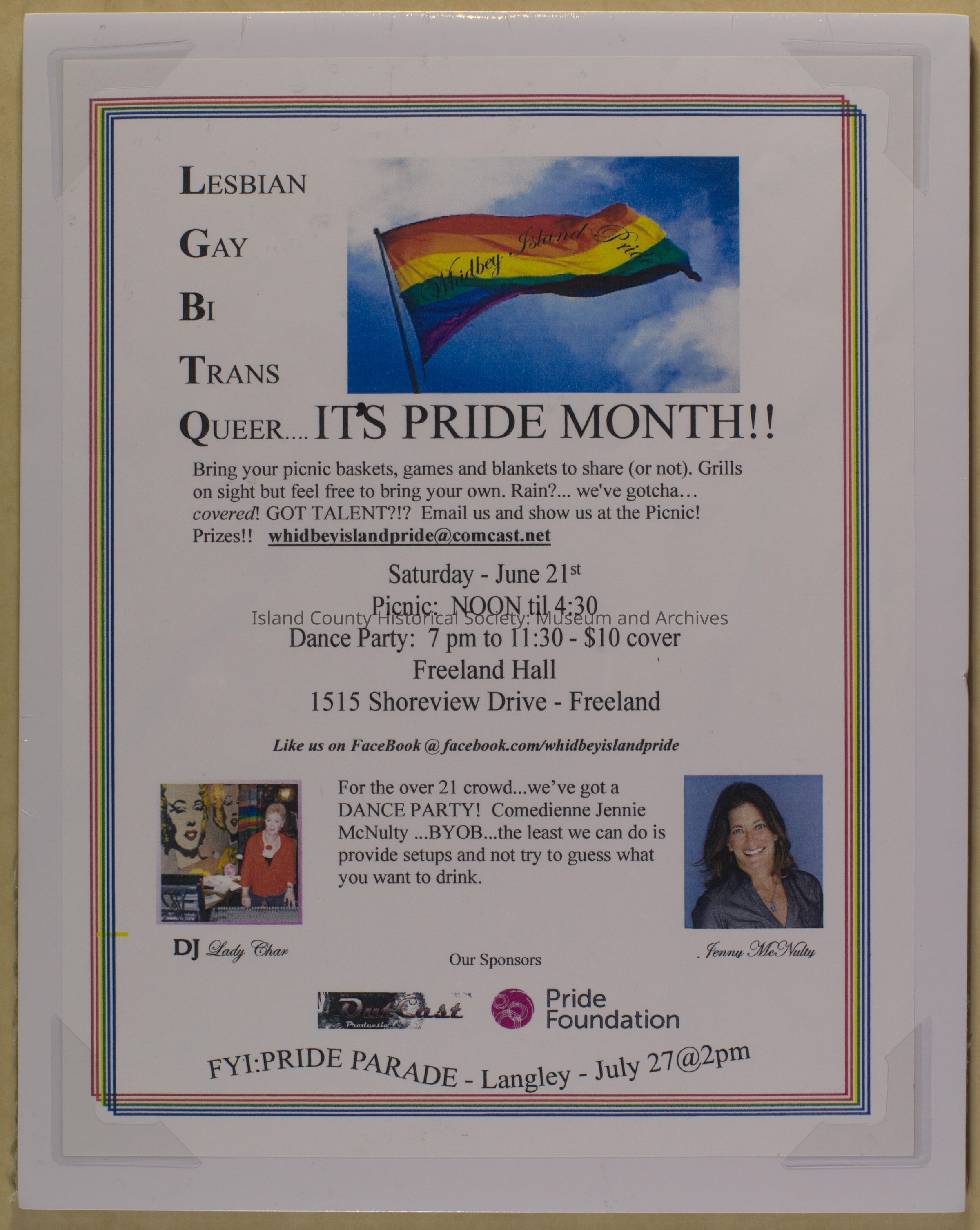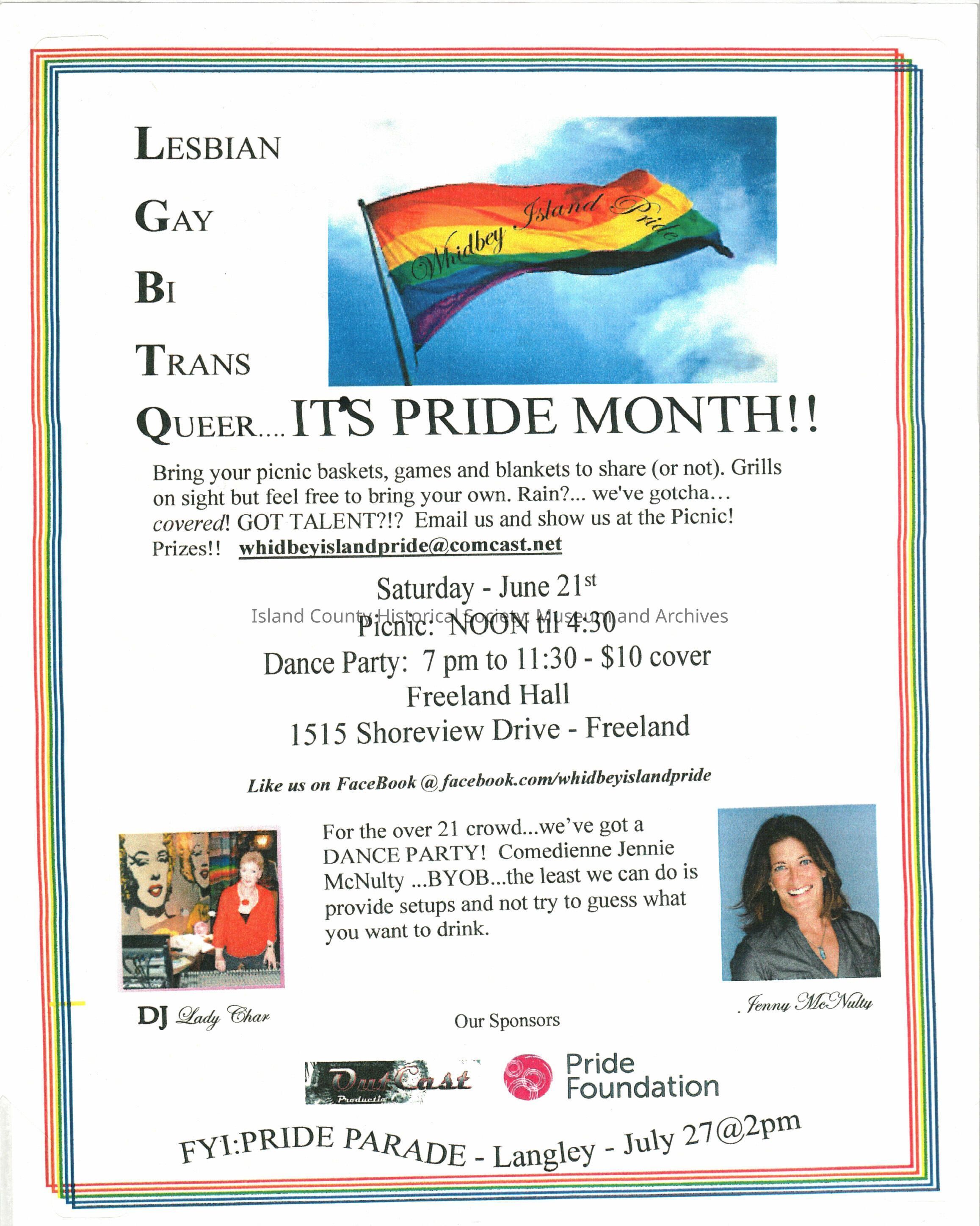 Leaflet advertising the first Gay Pride event on Whidbey Island. It states: Lesbian Gay Bi Trans Queet... It's Pride Month!! Brin your picnic baskets, games and blankets to share (or not). Grills on sight but feel free to bring your own. Rain?... we've gotcha... covered! GOT TALENT?!? Email us and show us at the Picnic! Prizes!! whidbeyislandpride@comcast.net