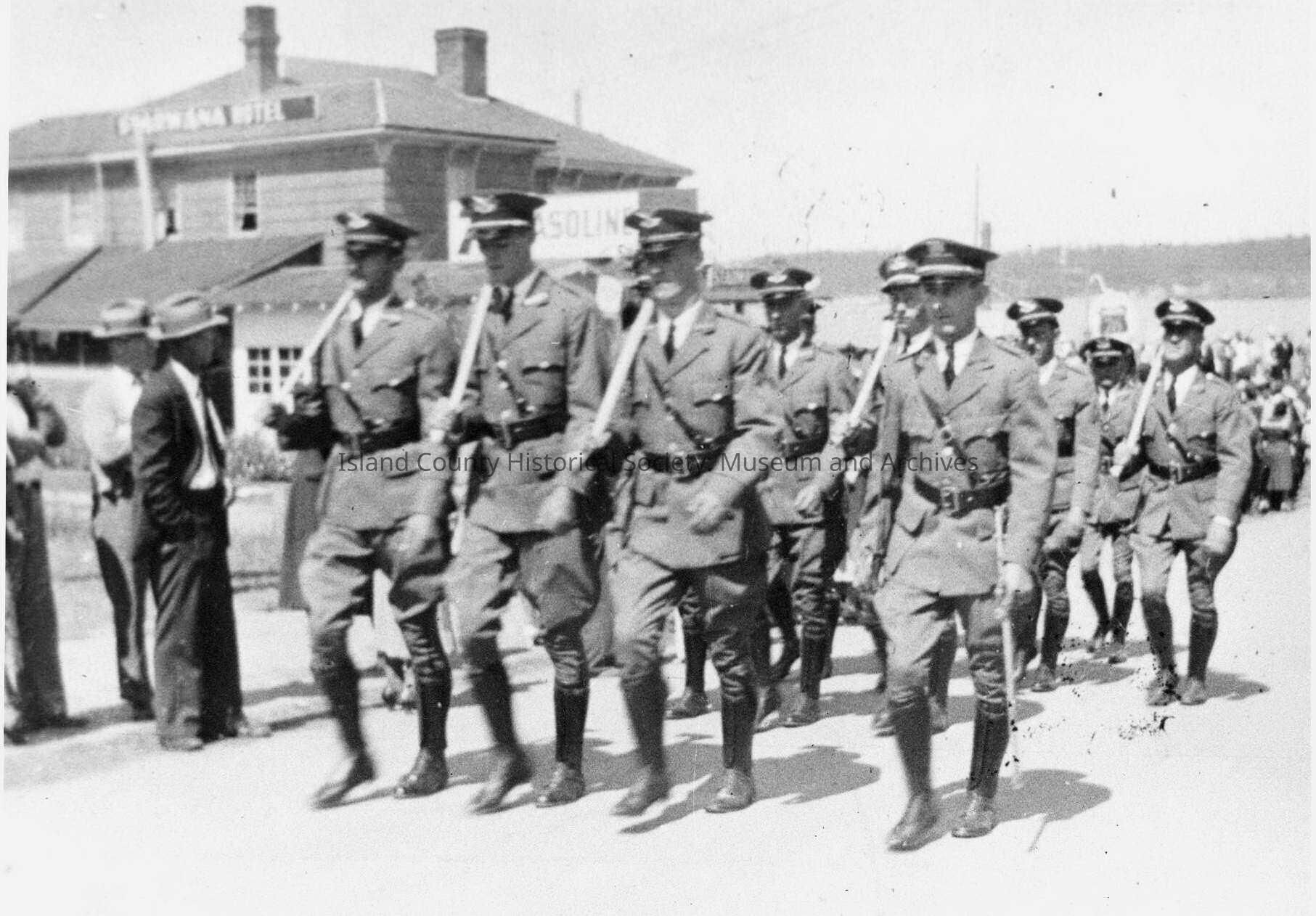 A black and white photograph of a Water Festival parade in front of Starwanna Hotel. Uniformed men, whether army or law enforcement, march along the roadside.Collection