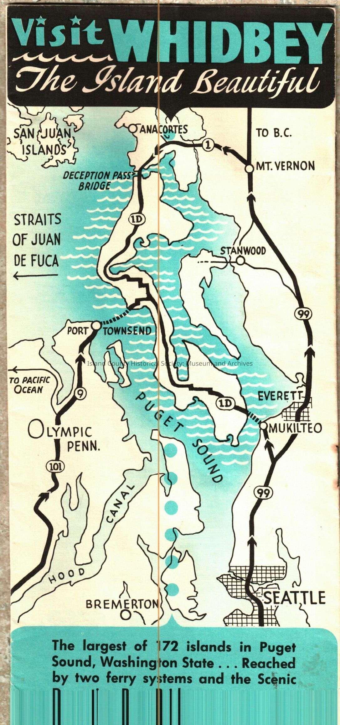 "Visit Whidbey The Island Beautiful" pamphlet with a map is a tourism hand out advertising Whidbey Island. It tells of great fishing and sailing. It highlights places to go and gives a short history of the island. It is printed in black white and blue. There are eight pages which are divided between maps and text. Headlines inlcude "Welcome to Whidbey Island" "A Bit of Whidbey History" "Business Directory" "Resorts" "Whidbey Island Schools" and "Churches."