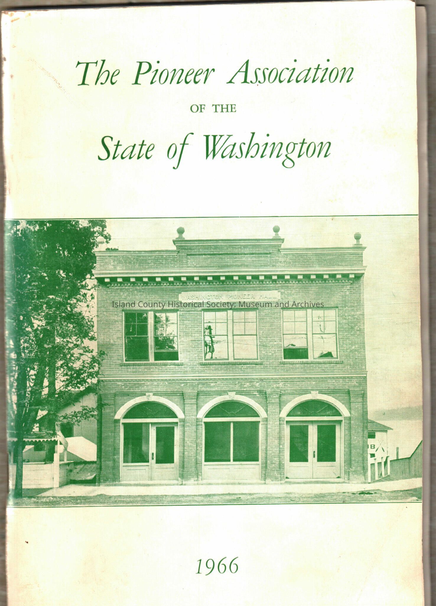 The annual report for 1966 of the Pioneer Association of the State of Washington. The cover is printed in green ink. The first few pages outline the history of the organization. The rest of the book lists the officers, chapters, presidents, and members. The whole booklet is 86 pages.