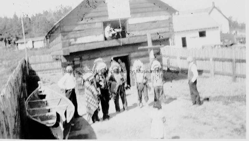 A sepia photograph of a group of Native Americans in front of the Alexander blockhouse. The Native Americams, in ceremonial garb stand with a couple of Caucasian males within the fenced area in which the blockhouse sits. There is a cross outside the blockhouse and a canoe to the left. A girl stands in front of them, her back to the camera. A couple people are sitting looking out from the upper storey of the blockhouse window.