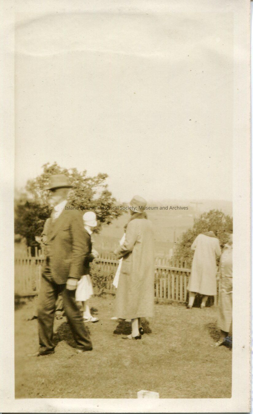 A black and white photo of an older man in a suit, wearing glasses and a hat (possibly the same man as in 2015.074.199). He is walking. There are women standing and looking in different directions. They are wearing long coats, hats. There is a picket fence behind them and some low trees or shrubs.