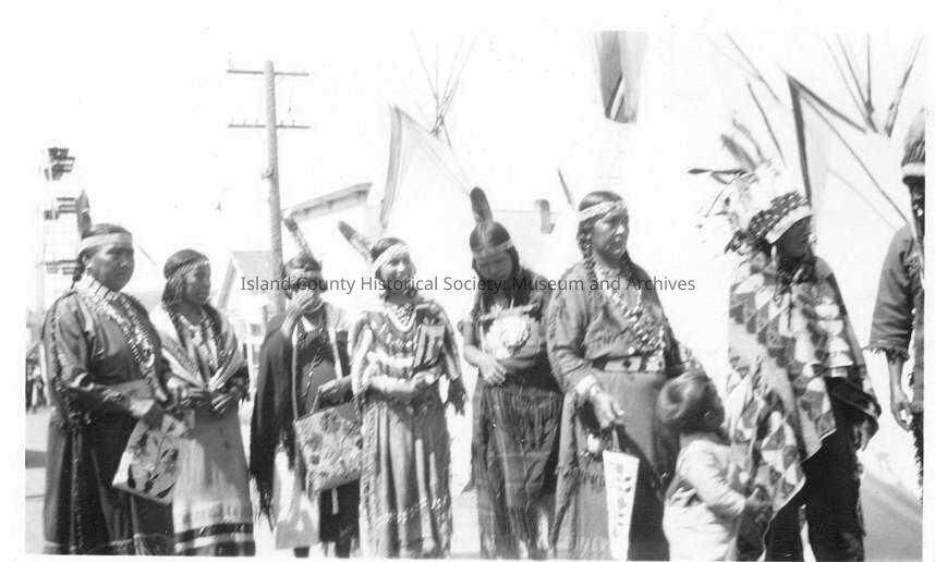 Black and white photograph of a group of Native American women at the Water Festival 1933. Teepees are lined up behind them.