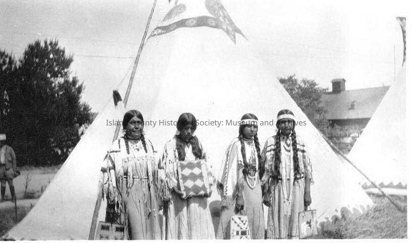 Four Native American women in front of a teepee. Partial view of another teepee on the right hand side. They wear traditional clothing, including headdresses, bags and their shawls and other attire are covered in shells (and beads?). Water Festival 1933 (date provided on back).Collection