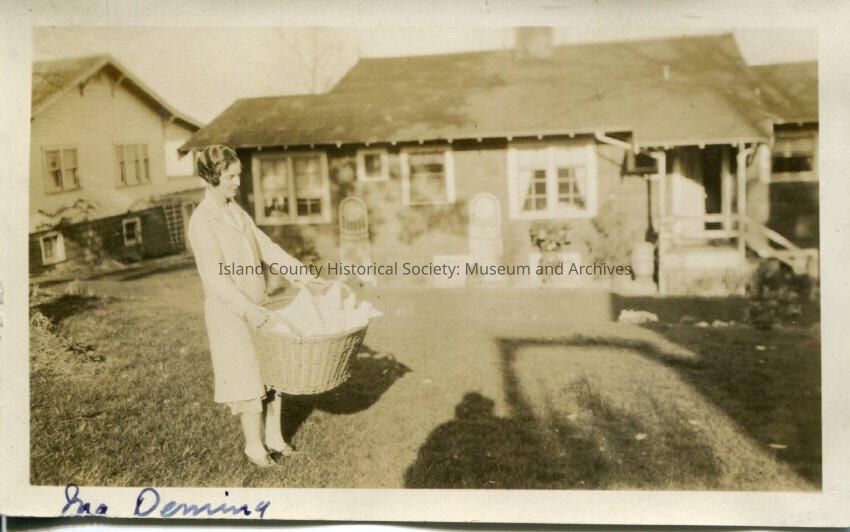 A black and white photo of a woman in a dress holding a laundry basket in front of a small house. There are long shadows and possibly the person taking the picture is another shadow in front. On the bottom: "Ina Deming".
