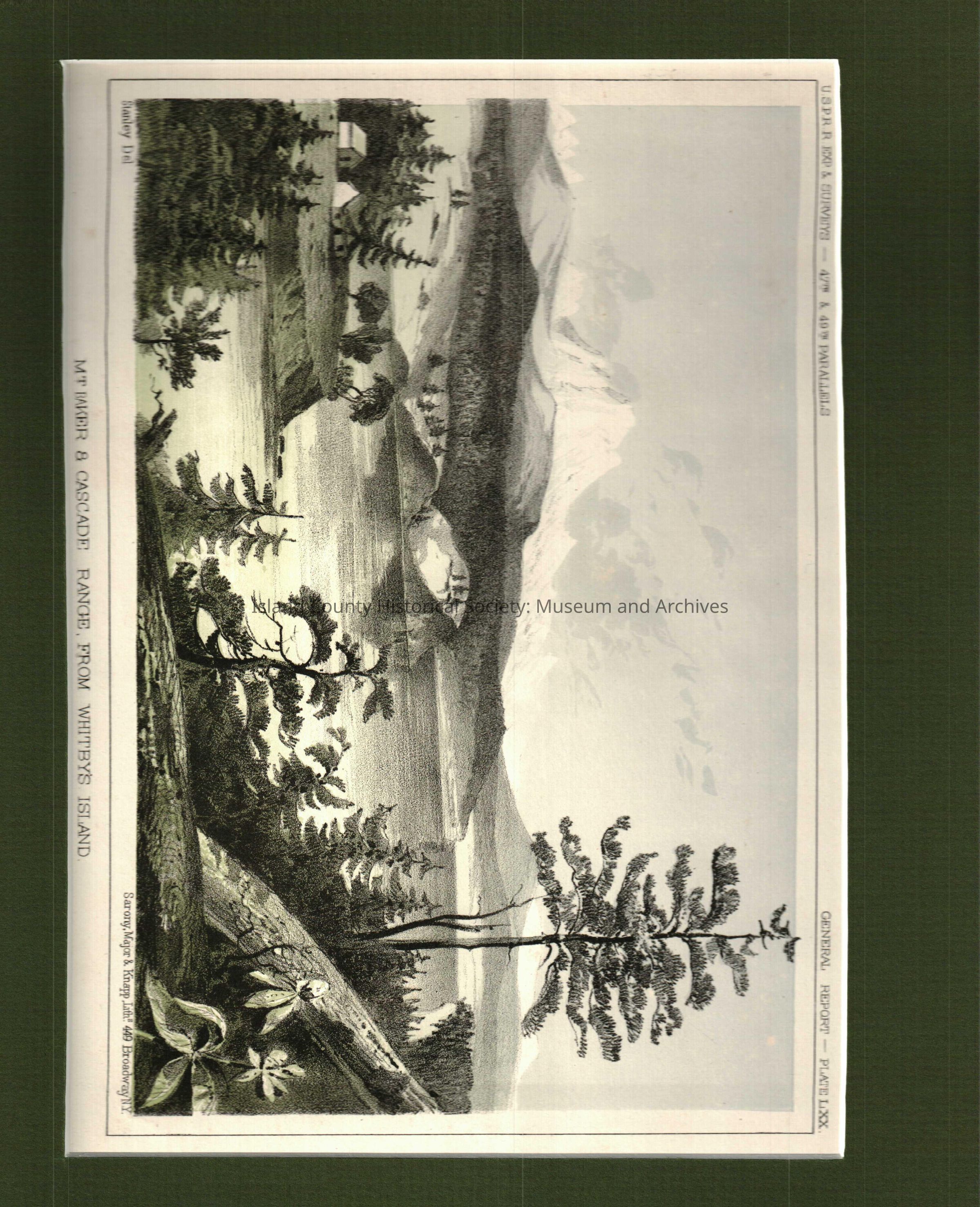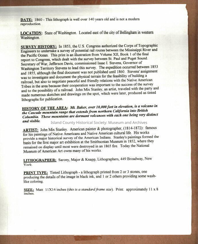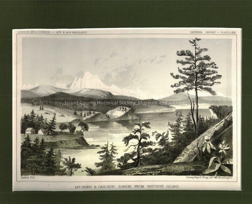 14"x11"color lithograph from 1860 titled "Mt. Baker & Cascade Range, from Whitby's Island"