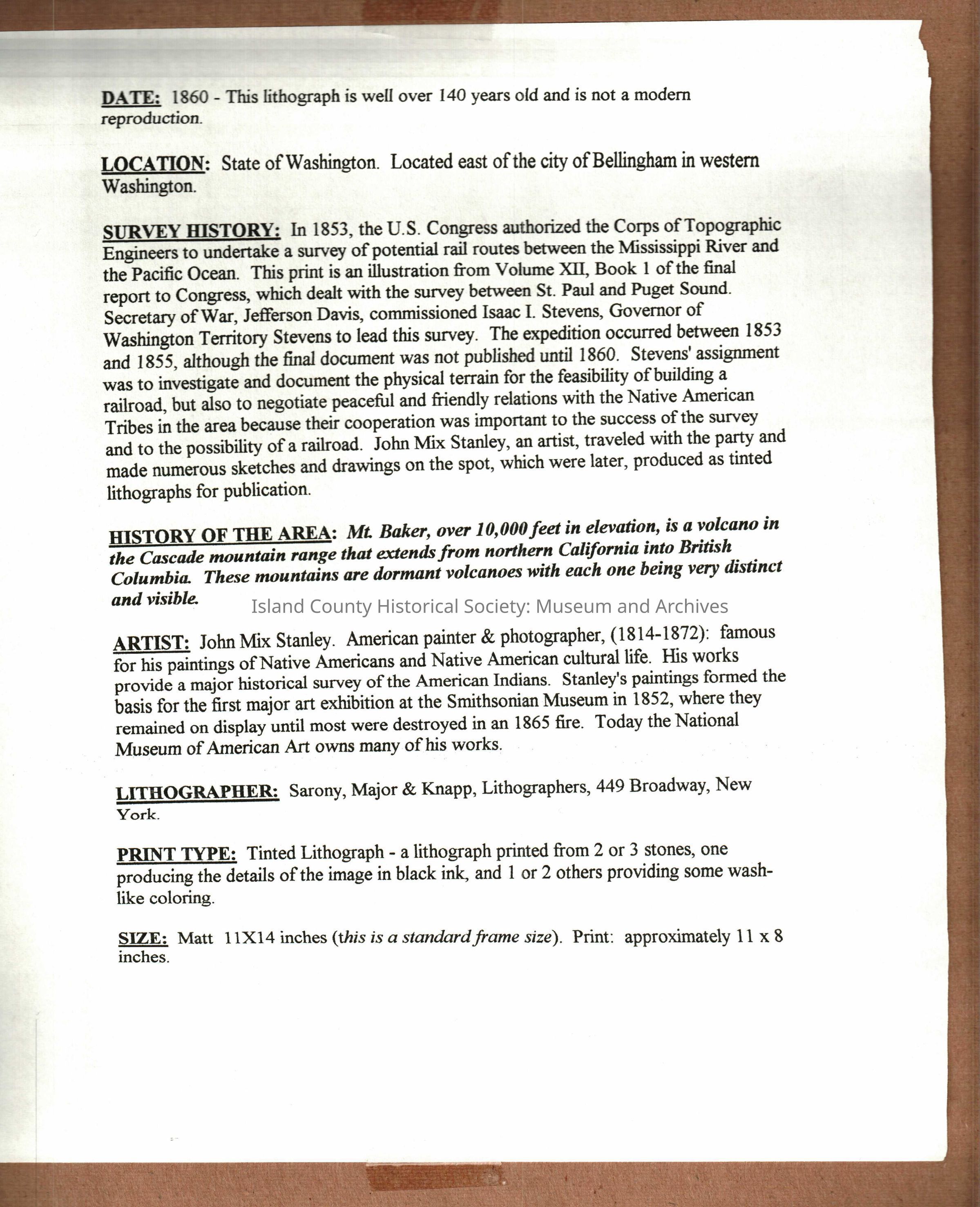 On the back is a typewritten page with details regarding the source, history, artist, lithographer. print type, size.