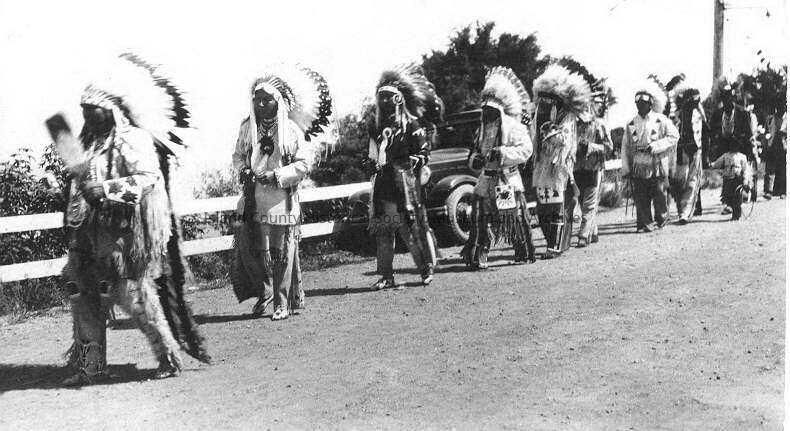 A black and white photograph of a parade at the 1933(?) Water Festival. Native American men in ceremonal dress proceed along the street in single file. A wooden fence and bushes along the coastline are to the right of them.