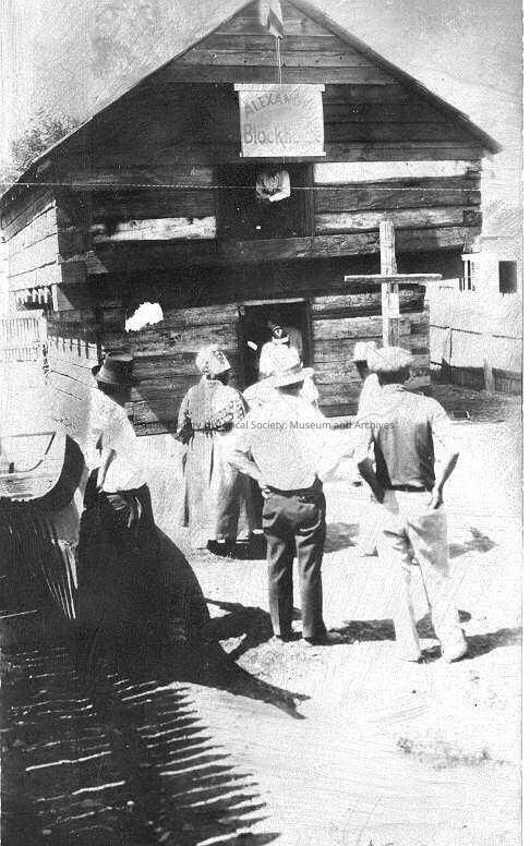 A black and white photograph of a few people standing outside looking towards the Alexander Blockhouse. A couple people can be seen inside the blockhouse. A cross is standing in front of the blockhouse. Part of the photograph has flaked off (left side, lower storey of the blockhoue). Date is written in the bottom right corner.Collection