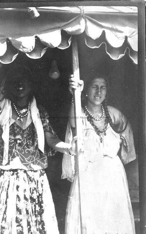 A black and white photograph of two Native American women wearing loose dresses and beaded necklaces. The stand together under a canopy, both extending an arm to hold onto the pole in the middle. One on left is mostly in shadow, and the lady on the right is squinting a little in the sun Her hair is braided. A lightbulb extends from the canopy. Date is written at the bottom.Collection