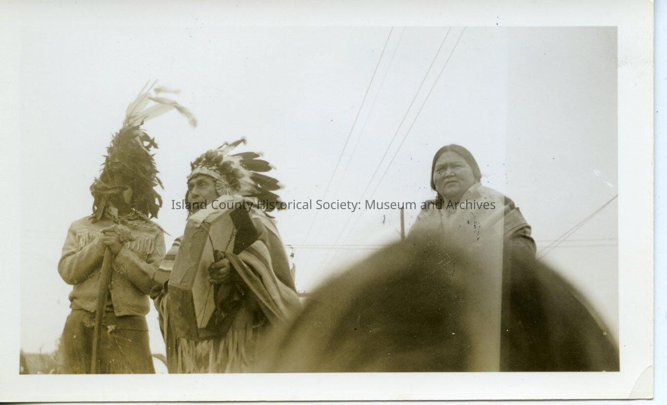 Negative of three Native Americans in traditional garb at the Coupeville water festival 1935. Two are male, off to the left of the photo, and to the right is a woman. The two men were headdresses, the face of the man furthest left is completely obscured by the headdress. The man next to him holding a heptagonal drum made of wood and animal skin. In foreground is a blurred top of a person's head.Collection