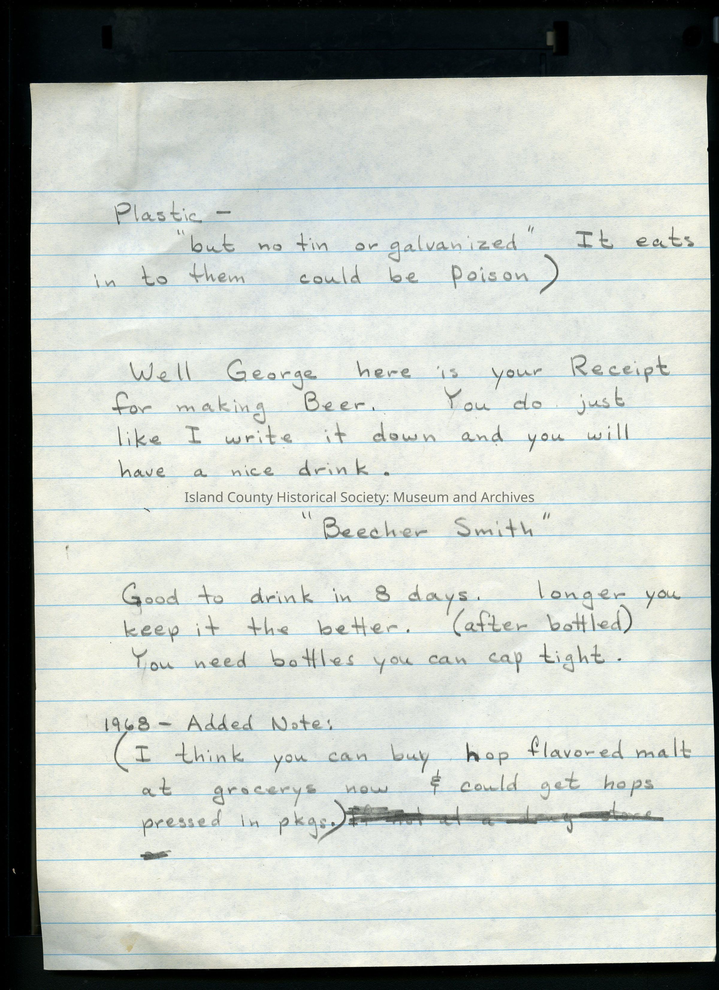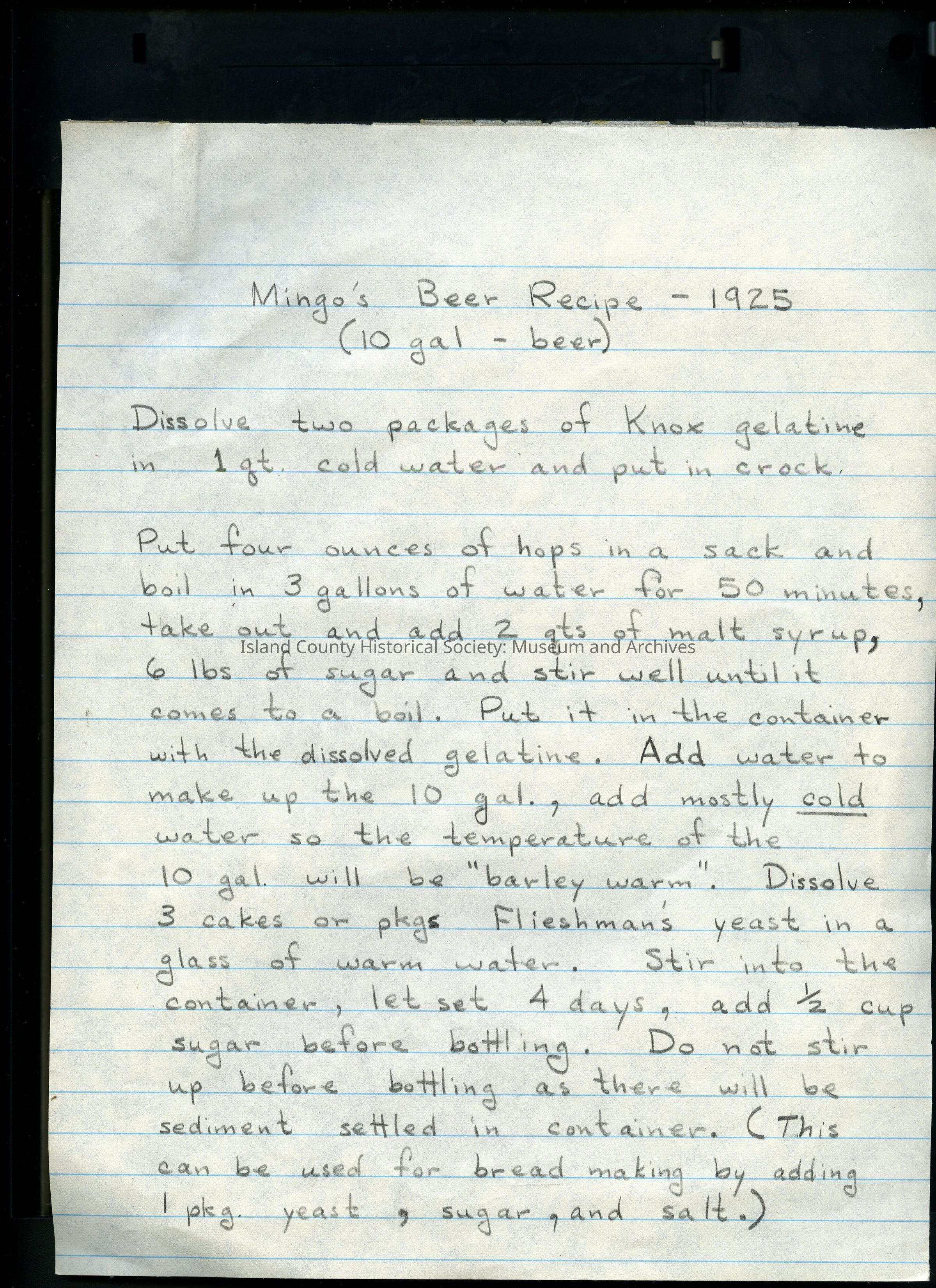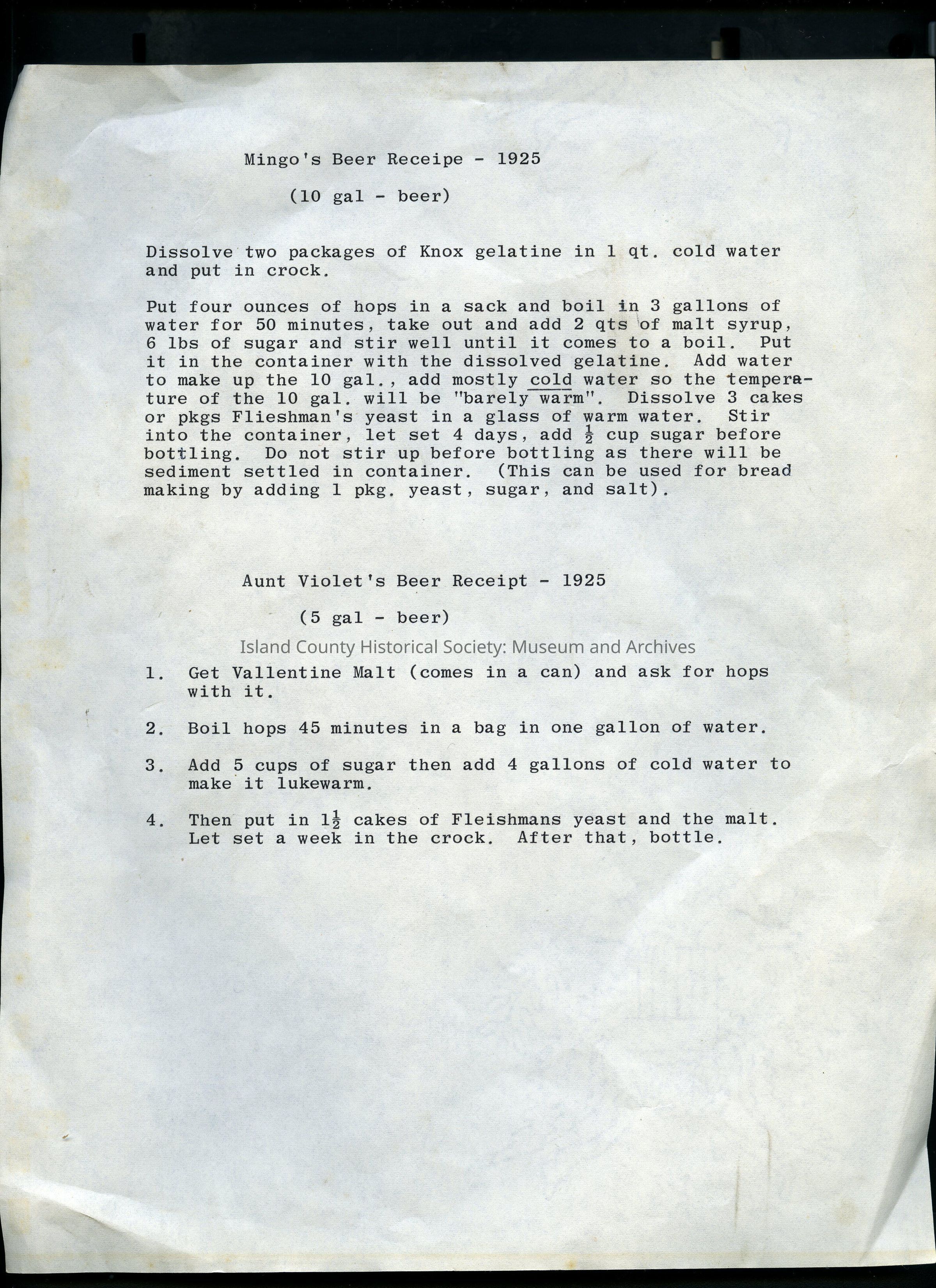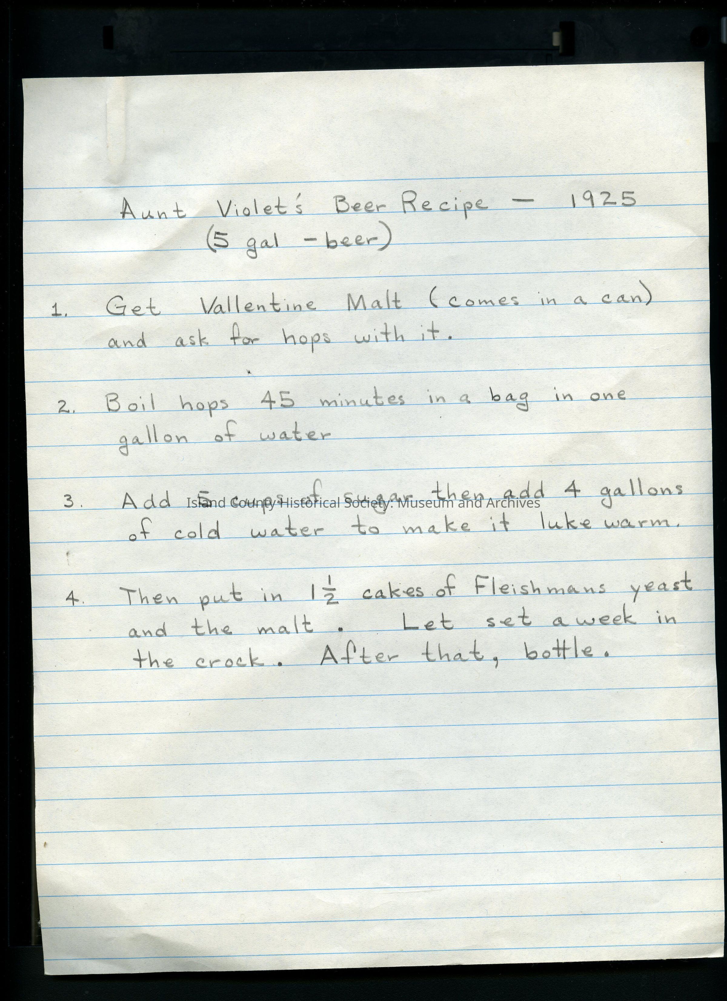 Beer Recipe, recorded by Beecher Smith "Copied exactly as sent to Grandfather Wilson, Roche Harbor, Wash - June 18 1926). Includes recipes labelled "Beecher" "Beecher Smith" "Mingo's" and "Aunt Violet's"Archive Details