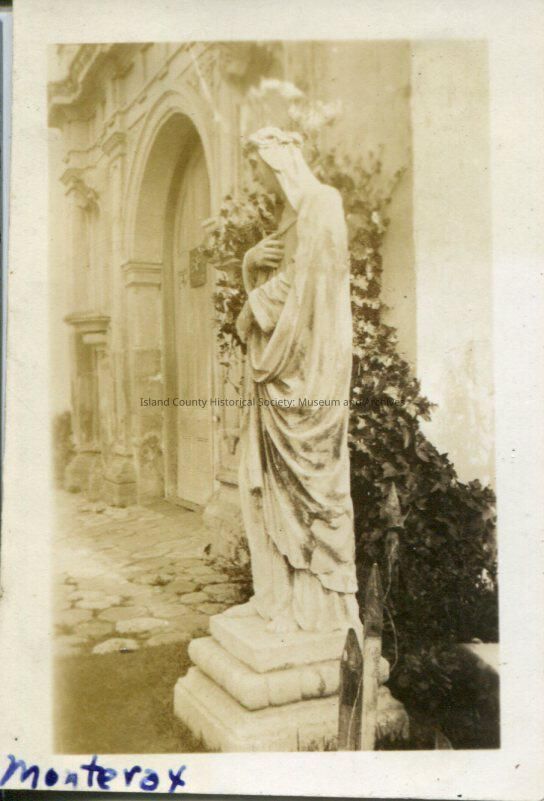 A black and white photo of a statue beside a church doorway. On the bottom: "Monteray". (The next photo has a memorial in Monterey, California, so this is a slight mis-spelling on the photo). Related photos: 2015.074.211-.217.