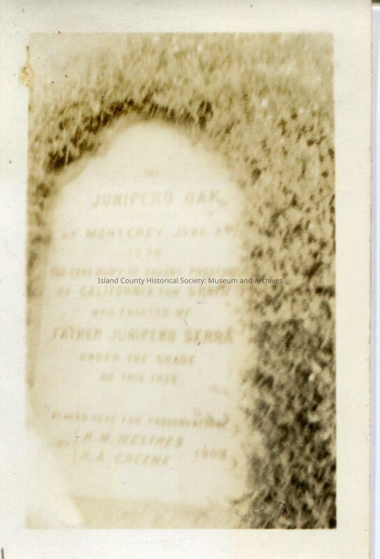 A black and white photo of a marker about a Junipero Oak in memory of Father Junipero Serra who founded missions in Monterey, California.