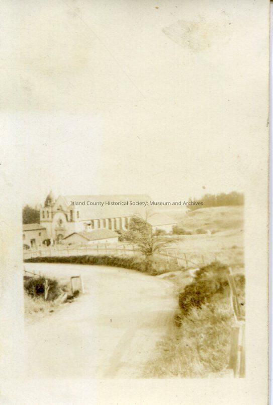 A black and white photo of a large stone church with arches, domed bell tower and outbuildings. The photo is taken at a distance along the road. Related photos: 2015.074.211-.217.