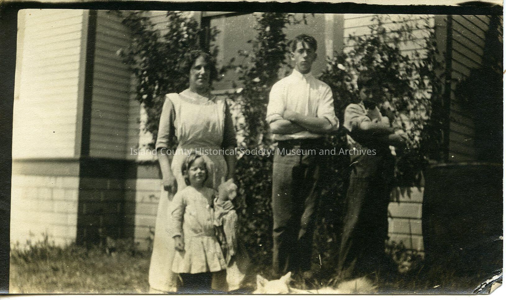 A photo of four people standing outside of a home. A woman and a man and a young girl and a boy. Handwritten on the back is "Daisy, Phyllis, Harold -? Ted?"