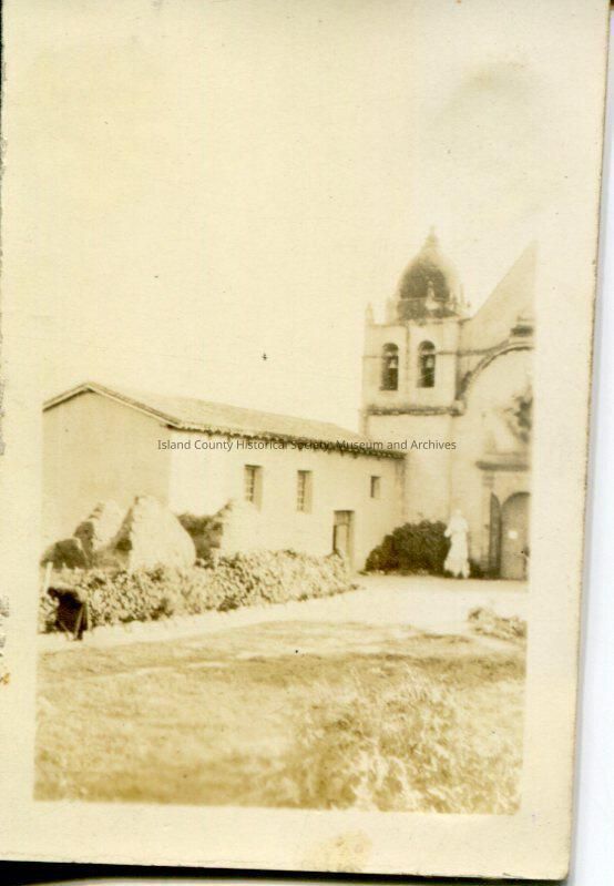 A black and white photo of a large stone church with arches, domed bell tower and the building near the bell tower. There is a statue near the doorway. Related photos: 2015.074.211-.217.