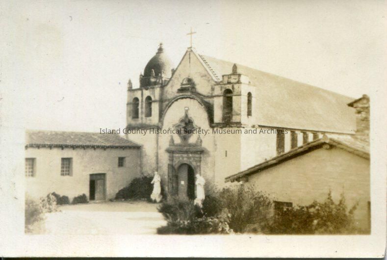 A black and white photo of a large stone church with arches, domed bell tower and the buildings on either side. There are two statues on either side of the doorway. Related photos: 2015.074.211-.217.