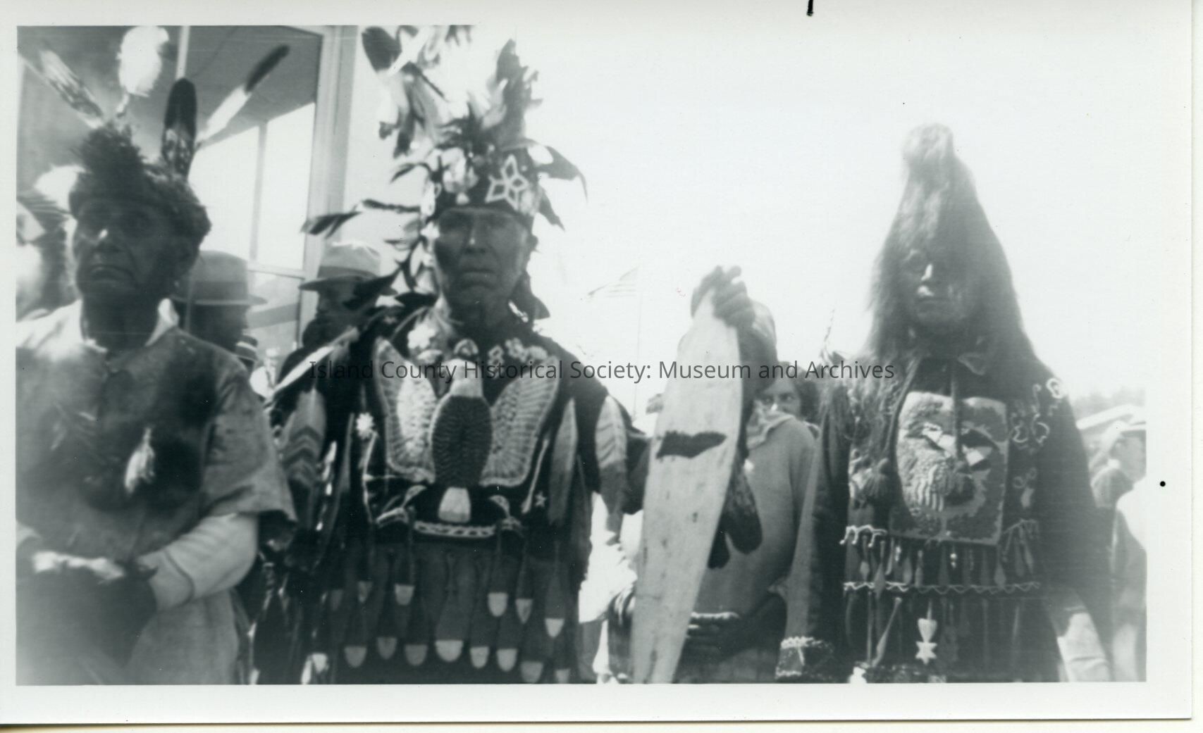 Negative of three older Native American men in ceremonial dress at the Water Festival 1930. Two of them wear very elaborate clothing, their tunics(?) decorated with a bird in the center.Collection