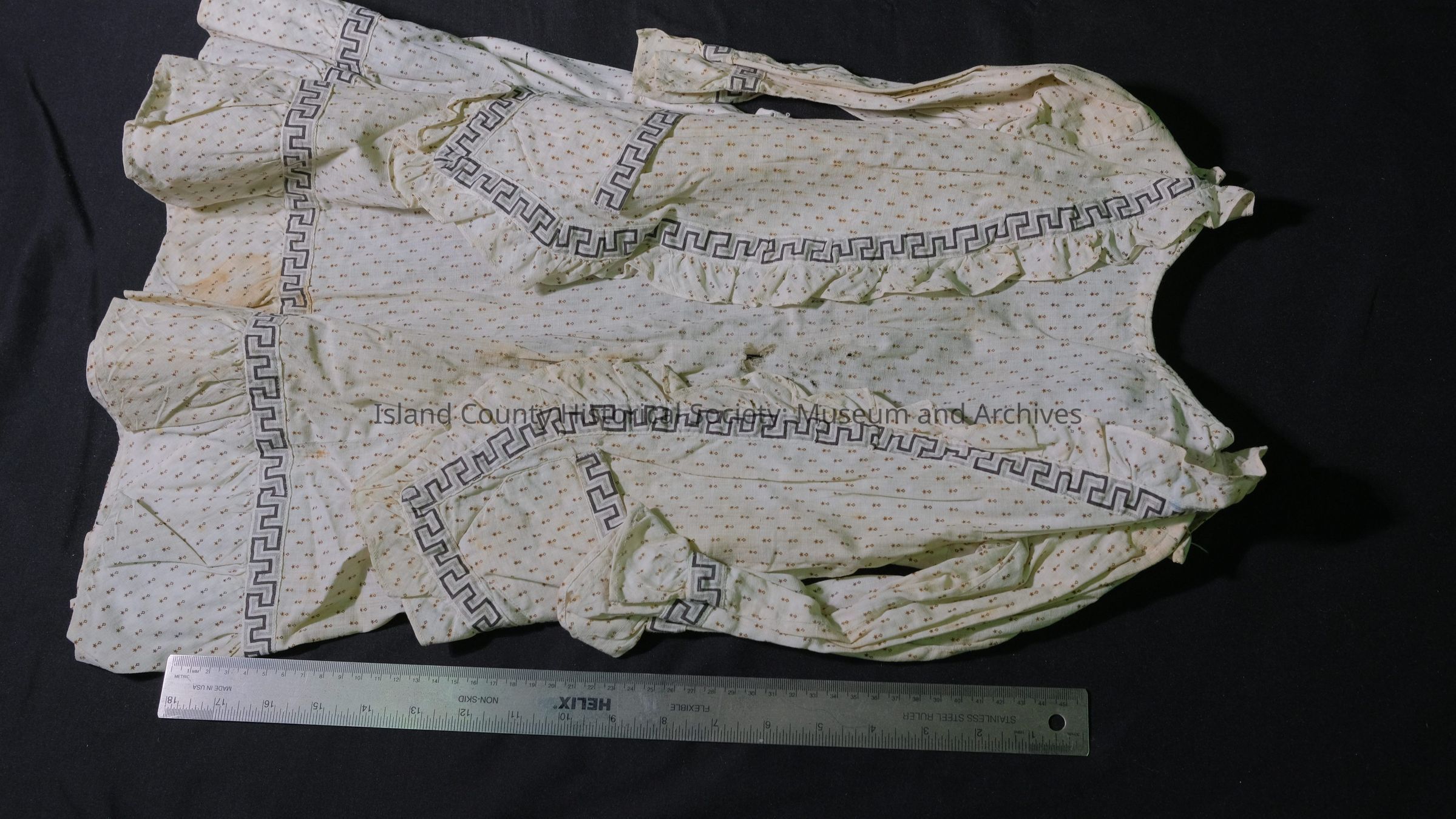 Child's dress, owned by May Zylstra's sister, Lyia McCaslin; brown figured white cotton, with black & grey fret trim.